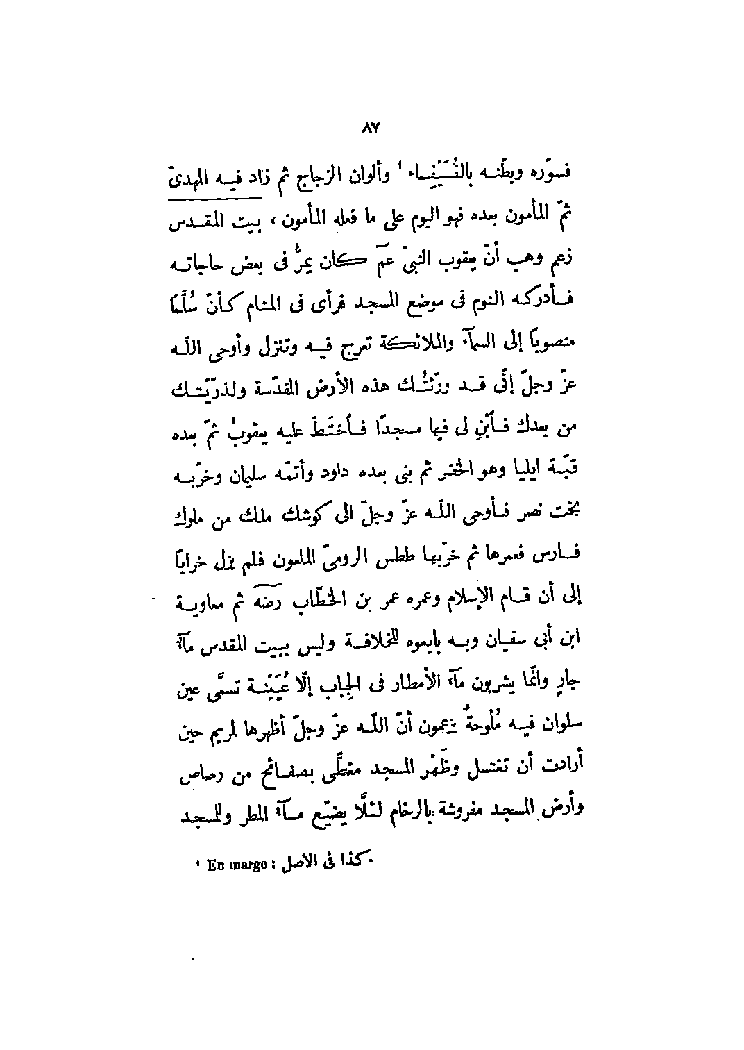 زعم وهب أن يعقوب النبي عم كان يمر في بعض حاجاته فأدركه النوم في موضع المسجد فرأى في المنام كأن سلما منصوبا إلى السماء والملائكة تعرج فيه وتنزل وأوحى الله عزّ وجلّ إنّ قد ورثتك هذه الأرض المقدسة ولذريتك من بعدك فابن لي فيها مسجدا فاختط عليه يعقوب ثم بعده قبة ايليا وهو الخضر ثم بنى بعده داود وأتمه سليمان وخربه نصر فاوحى الله عز وجل إلى كوشك ملك من ملوك فارس فعمرها ثم خربها ططس الرومي الملعون فلم يزل خرابا إلى أن قام الإسلام وعمره عمر بن الخطاب رضي الله عنه ثم معاوية ابن أبي سفيان وبه بايعوه للخلافة وليس ببيت المقدس ماء جار وإنما يشربون ماء الأمطار في الجباب إلّا عينة تسمى عين سلوان فيه ملوحة يزعمون أن الله عز وجل أظهرها لمريم حين أرادت أن تغتسل وظهر المسجد مغطى بصفائح من رصاص وأرض المسجد مفروشة بالرخام لئلا يضيع ماء المطر وللمسجد