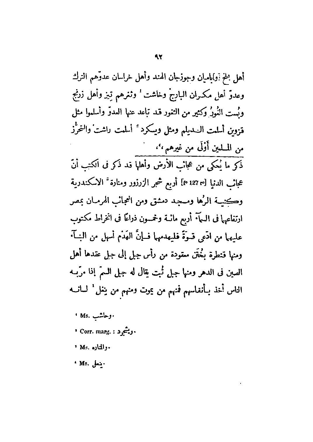 قد ذكر في الكتب أن عجائب الدنيا [F 127 r] أربع شجر الزرزور ومنارة [3] الاسكندرية وكنيسة الرها ومسجد دمشق ومن العجائب الهرمان بمصر ارتفاعهما في السماء أربع مائة وخمسون ذراعا في انخراط مكتوب عليهما من ادعى قوة فليهدمهما فإن الهدم أسهل من البناء ومنها قنطرة بختن معقودة من رأس جبل إلى جبل عقدها أهل الصين في الدهر ومنها جبل تبت يقال له جبل السم إذا مر به الناس أخذ بأنفاسهم فمنهم من يموت ومنهم من ينغل [4] لسانه