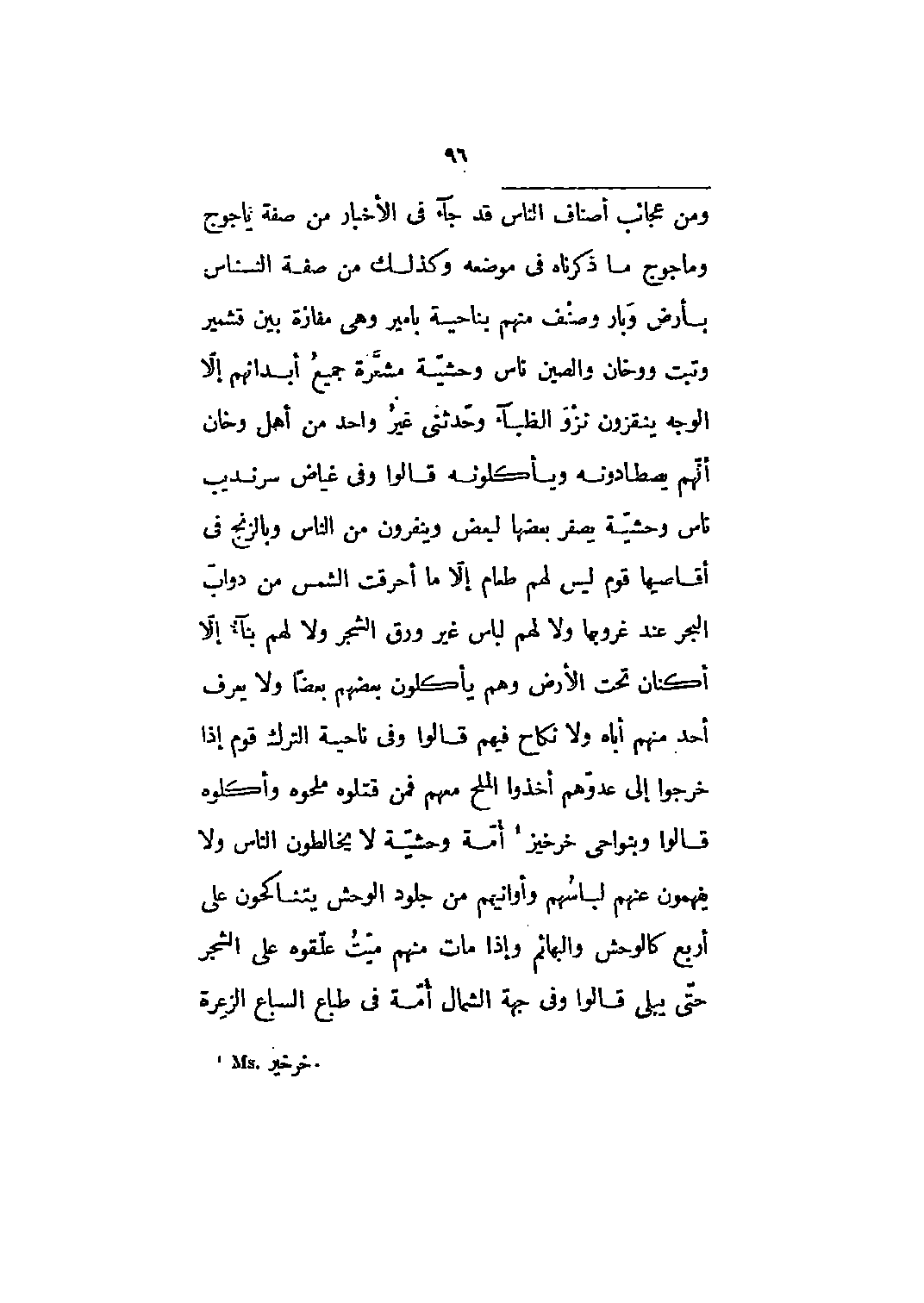 قد جاء في الأخبار من صفة يأجوج ومأجوج ما ذكرناه في موضعه وكذلك من صفة النسناس بأرض وبار وصنف منهم بناحية بامير وهي مفازة بين قشمير وتبت ووخان والصين ناس وحشية مشعرة جميع أبدانهم إلا الوجه ينقزون نزو الظباء وحدثني غير واحد من أهل وخان أنهم يصطادونه ويأكلونه قالوا وفي غياض سرنديب ناس وحشية يصفر بعضها لبعض وينفرون من الناس وبالزنج في أقاصيها قوم ليس لهم طعام إلا ما أحرقت الشمس من دواب البحر عند غروبها ولا لهم لباس غير ورق الشجر ولا لهم بناء إلا أكنان تحت الأرض وهم يأكلون بعضهم بعضا ولا يعرف أحد منهم أباه ولا نكاح فيهم قالوا وفي ناحية الترك قوم إذا خرجوا إلى عدوهم أخذوا الملح معهم فمن قتلوه ملحوه وأكلوه قالوا وبنواحي خرخيز [1] أمة وحشية لا يخالطون الناس ولا يفهمون عنهم لباسهم وأوانيهم من جلود الوحش يتناكحون على أربع كالوحش والبهائم وإذا مات منهم ميت علقوه على الشجر حتى يبلى قالوا وفي جهة الشمال أمة في طباع السباع الزعرة