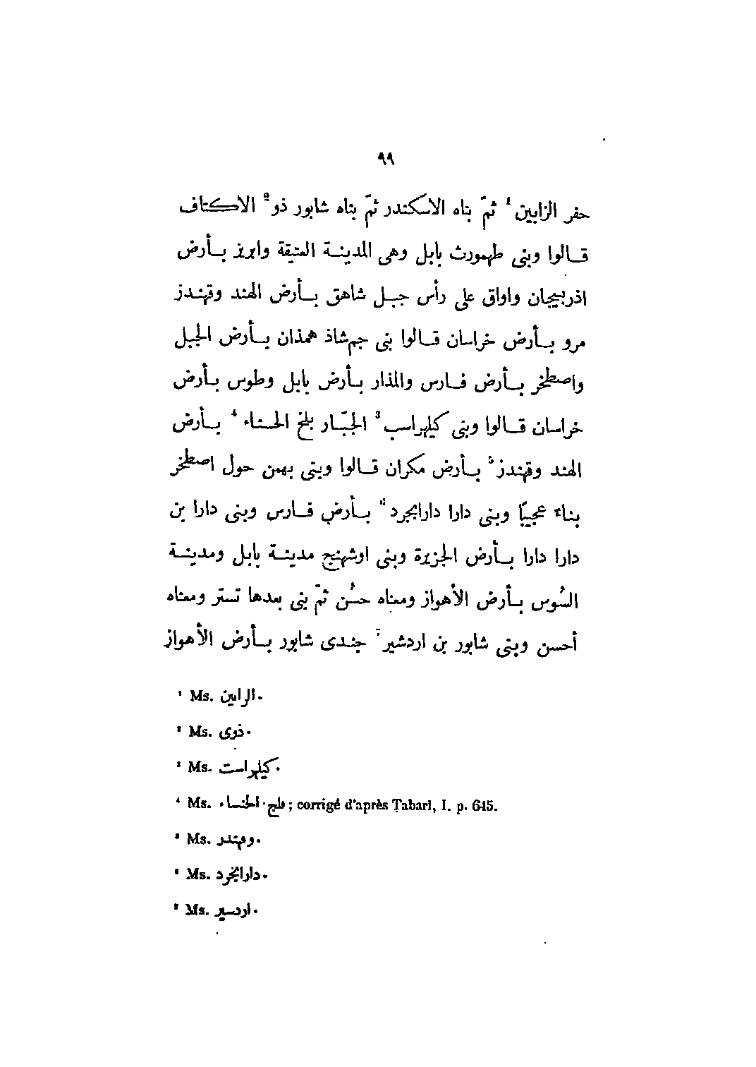 حفر الزابين [1] ثم بناه الاسكندر ثم بناه شابور ذو [2] الأكتاف قالوا وبنى طهمورث بابل وهي المدينة العتيقة وإبريز بأرض آذربيجان واواق على رأس جبل شاهق بأرض الهند وقهندز مرو بأرض خراسان قالوا بنى جم شاذ همذان بأرض الجبل واصطخر بأرض فارس والمذار بأرض بابل وطوس بأرض خراسان قالوا وبني كيلهراسب [3] الجبار بلخ الحسناء [4] بأرض الهند وقهندز [5] بأرض مكران قالوا وبني بهمن حول إصطخر بناء عجيبا وبنى دارا دارا بجرد [6] بأرض فارس وبنى دارا بن دارا دارا بأرض الجزيرة وبنى اوشهنج مدينة بابل ومدينة السوس بأرض الأهواز ومعناه حسن ثم بنى بعدها تستر ومعناه أحسن وبنى شابور بن أردشير [7] جنديشابور بأرض الأهواز