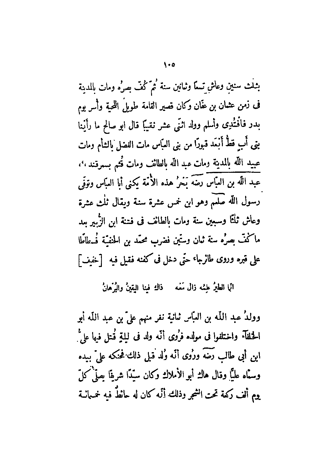 بحر هذه الأمة يكنى أبا العباس وتوفي رسول الله صلى الله عليه وسلم وهو ابن خمس عشرة سنة ويقال ثلث عشرة وعاش ثلثا وسبعين سنة ومات بالطائف في فتنة ابن الزبير بعد ما كف بصره سنة ثمان وستين فضرب محمد بن الحنفية فسطاطاً على قبره وروى طائر جاء حتى دخل في كفنه فقيل فيه [خفيف]