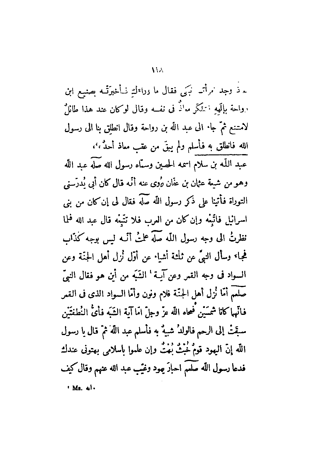 اسمه الحصين وسمّاه رسول الله صله عبد الله وهو من شيعة عثمان بن عفان روي عنه أنه قال كان أبي يدرسني التوراة فأتينا على ذكر رسول الله صله فقال لي إن كان من بني إسرائيل فاتبعه وإن كان من العرب فلا تتّبعه قال عبد الله فلما نظرت إلى وجه رسول الله صله علمت أنه ليس بوجه كذاب فجاء وسأل النبي عن ثلاثة أشياء عن أول نزل أهل الجنة وعن السواد في وجه القمر وعن آية [1] الشبه من أين هو فقال النبي صلى الله عليه وسلم أما نزل أهل الجنة فلام ونون وأما السواد الذي في القمر فإنهما كانا شمسين فمحاه الله عز وجل أما آية الشبه فأي النطفتين سبقت إلى الرحم فالولد شبيه به فأسلم عبد الله ثم قال يا رسول الله إن اليهود قوم خبث بهت وإن علموا بإسلامي بهتوني عندك فدعا رسول الله صلى الله عليه وسلم أحبار يهود وغيب عبد الله عنهم وقال كيف