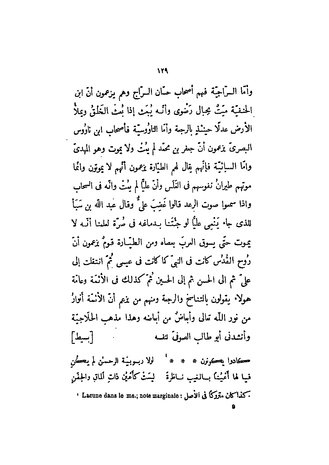 وأما السراجية فهم أصحاب حسان السراج وهم يزعمون أن ابن الحنفية ميت بجبال رضوى وأنه يبعث إذا بعث الخلق ويملأ الأرض عدلا حينئذ بالرجعة وأما الناووسية فأصحاب ابن ناووس البصري يزعمون أن جعفر بن محمد لم يمت ولا يموت وهو المهدي وأما السبائية فإنهم يقال لهم الطيارة يزعمون أنهم لا يموتون وإنما موتهم طيران نفوسهم في الغلس وأن علياً لم يمت وأنه في السحاب وإذا سمعوا صوت الرعد قالوا غضب علي وقال عبد الله بن سبأ للذي جاء ينعى علياً لو جئتنا بدماغه في صرة لعلمنا أنه لا يموت حتى يسوق العرب بعصاه ومن الطيارة قوم يزعمون أن روح القدس كانت في النبي كما كانت في عيسى ثم انتقلت إلى علي ثم إلى الحسن ثم إلى الحسين ثم كذلك في الأئمة وعامة هؤلاء يقولون بالتناسخ والرجعة ومنهم من يزعم أن الأئمة أنوار من نور الله تعالى وأبعاض من أبعاضه وهذا مذهب الحلّاجيّة وأنشدنى أبو طالب الصوفىّ لنفسه [بسيط]