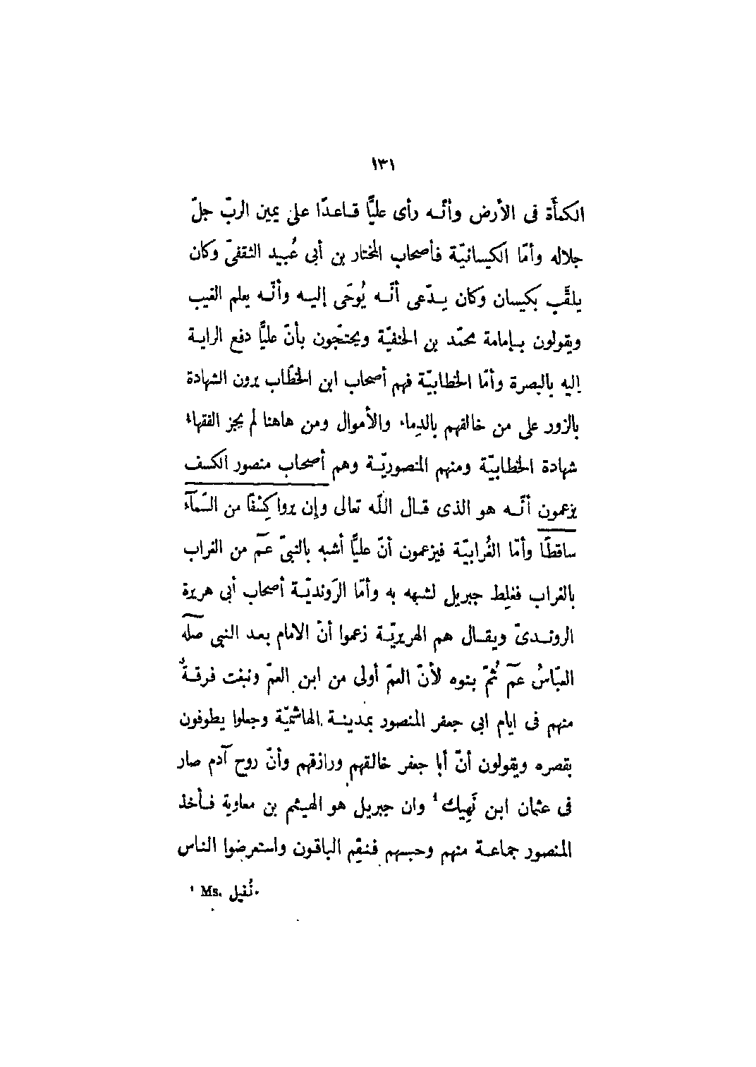 الكمأة في الأرض وأنه رأى علياً قاعداً على يمين الرب جل جلاله وأما الكيسانية فأصحاب المختار بن أبي عبيد الثقفي وكان يلقب بكيسان وكان يدعي أنه يوحى إليه وأنّه يعلم الغيب ويقولون بإمامة محمّد بن الحنفية ويحتجون بأن علياً دفع الراية إليه بالبصرة وأما الخطابية فهم أصحاب ابن الخطاب يرون الشهادة بالزور على من خالفهم بالدماء والأموال ومن هاهنا لم يجز الفقهاء شهادة الخطابية ومنهم المنصورية وهم أصحاب منصور الكسف يزعمون أنه هو الذي قال الله تعالى وَإِنْ يَرَوْا كِسْفاً من السَّماءِ ساقِطاً 52: 44 وأما الغرابية فيزعمون أن عليا أشبه بالنبيّ عم من الغراب بالغراب فغلط جبريل لشبهه به وأما الروندية أصحاب أبي هريرة الروندي ويقال هم الهريرية زعموا أن الإمام بعد النبي صله العبّاس عم ثم بنوه لأن العم أولى من ابن العم ونبغت فرقة منهم في أيام أبي جعفر المنصور بمدينة الهاشمية وجعلوا يطوفون بقصره ويقولون أن أبا جعفر خالقهم ورازقهم وأن روح آدم صار في عثمان ابن نهيك [1] وأن جبريل هو الهيثم بن معاوية فأخذ المنصور جماعة منهم وحبسهم فنقم الباقون واستعرضوا الناس