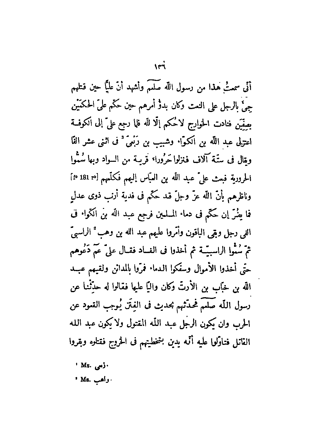 أني سمعت هذا من رسول الله صلى الله عليه وسلم وأشهد أن علياً حين قتلهم جيء بالرجل على النعت وكان بدؤ أمرهم حين حكم على الحكمين بصفين فنادت الخوارج لا حكم إلا للَّه فلما رجع علي إلى الكوفة اعتزل عبد الله بن الكواء وشبيب بن ربعي [1] في اثني عشر ألفاً ويقال في ستة آلاف فنزلوا حروراء قرية من السواد وبها سموا الحرورية فبعث علي عبد الله بن العباس إليهم فكلمهم [F؟ 181 r؟] وناظرهم بأن الله عز وجل قد حكم في فدية أرنب ذوي عدلٍ فما يضر إن حكم في دماء المسلمين فرجع عبد الله بن الكواء في ألفي رجل وبقي الباقون وأمروا عليهم عبد الله بن وهب [2] الراسبي ثم سموا الراسبية ثم أخذوا في الفساد فقال عليّ عم دعوهم حتى أخذوا الأموال وسفكوا الدماء فمروا بالمدائن ولقيهم عبد الله بن خباب بن الأرت وكان والياً عليها فقالوا له حدثنا عن رسول الله صلى الله عليه وسلم فحدثهم بحديث في الفتن يوجب القعود عن الحرب وان يكون الرجل عبد الله المقتول ولا يكون عبد الله القاتل فتأولوا عليه أنّه يدين بتخطئتهم في الخروج فقتلوه وبقروا