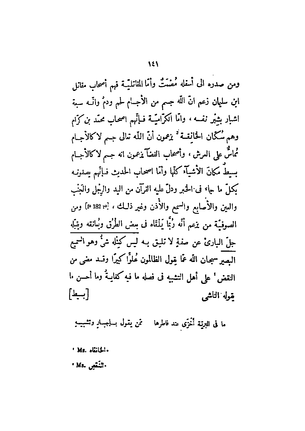 ومن صدره إلى أسفله مصمت وأما المقاتلية فهم أصحاب مقاتل ابن سليمان زعم أن الله جسم من الأجسام لحم ودم وأنه سبعة أشبارٍ بشبر نفسه، وأما الكرامية فإنهم أصحاب محمد بن كرام وهم سكان الخانقة [1] يزعمون أن الله تعالى جسم لا كالأجسام مماسّ على العرش، وأصحاب الفضاء يزعمون انه جسم لا كالأجسام بسيط مكان الأشياء كلها وأما أصحاب الحديث فإنهم يصفونه بكل ما جاء في الخبر ودل عليه القرآن من اليد والرجل والجنب والعين والأصابع والسمع والأذن وغير ذلك [F؟ 182 r؟] ، ومن الصوفية من يزعم أنه ربما يلقاه في بعض الطرق ويعانقه ويقبله جل البارئ عن صفةٍ لا تليق به لَيْسَ كَمِثْلِهِ شَيْءٌ وَهُوَ السَّمِيعُ الْبَصِيرُ 42: 11 سبحان الله عما يقول الظالمون علواً كبيراً وقد مضى من النقض [2] على أهل التشبيه في فصله ما فيه كفاية وما أحسن ما يقوله الناشي [بسيط]