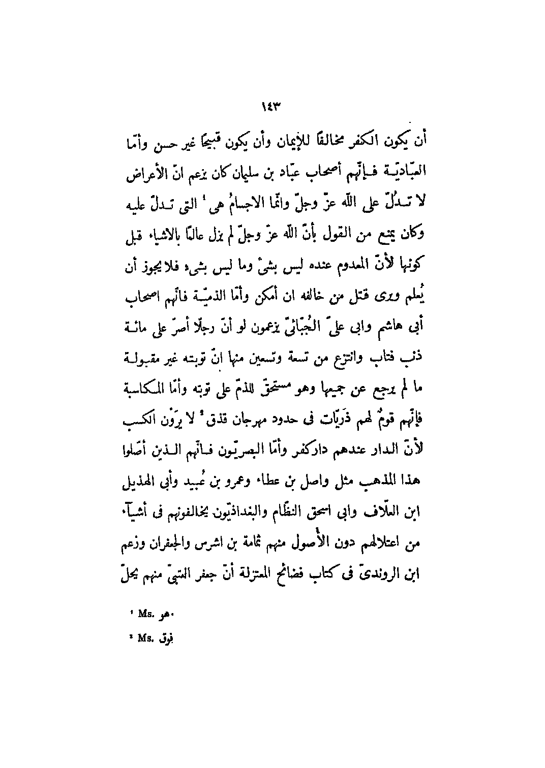 أن يكون الكفر مخالفاً للإيمان وأن يكون قبيحاً غير حسنٍ وأما العبادية فإنهم أصحاب عباد بن سليمان كان يزعم أن الأعراض لا تدل على الله عز وجل وإنما الأجسام هي [1] التي تدل عليه وكان يمنع من القول بأن الله عز وجل لم يزل عالماً بالأشياء قبل كونها لأن المعدوم عنده ليس بشيء وما ليس بشيءٍ فلا يجوز أن يعلم ويرى قتل من خالفه أن أمكن وأما الذمية فإنهم أصحاب أبي هاشم وأبي علي الجبائي يزعمون لو أن رجلاً أصر على مائة ذنب فتاب وانتزع من تسعة وتسعين منها أن توبته غير مقبولة ما لم يرجع عن جميعها وهو مستحق للذم على توبته وأمّا المكاسبة فإنّهم قوم لهم ذريات في حدود مهرجان قذق [2] لا يرون الكسب لأن الدار عندهم دار كفر وأما البصريون فإنهم الذين أصلوا هذا المذهب مثل واصل بن عطاء وعمرو بن عبيد وأبى الهذيل ابن العلّاف وابى إسحاق النظّام والبغداذيّون يخالفونهم في أشياء من اعتلالهم دون الأصول منهم ثمامة بن أشرس والجعفران وزعم ابن الروندي في كتاب فضائح المعتزلة أن جعفر العتبىّ منهم يحلّ