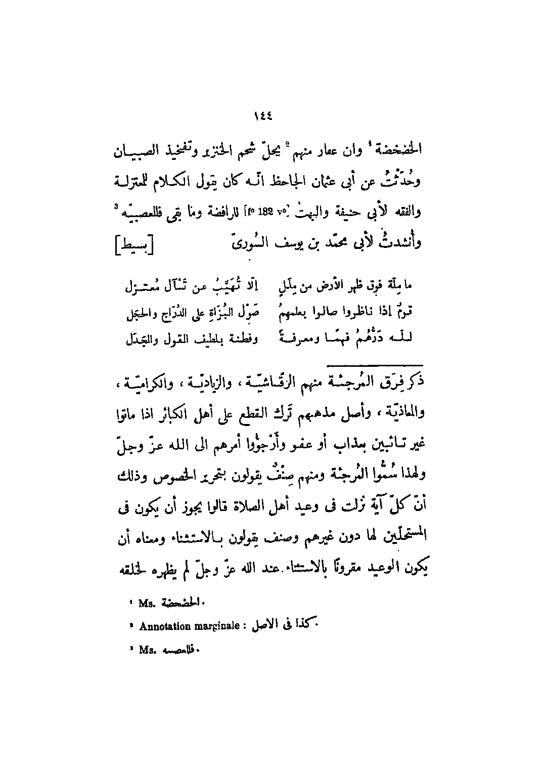 الخضخضة [1] وان ع؟ أر منهم [2] يحل شحم الخنزير وتفخيذ الصبيان وحدثت عن أبي عثمان الجاحظ أنه كان يقول الكلام للمعتزلة والفقه لأبي حنيفة والبهت [F 182 v؟] للرافضة وما بقي فللعصبية [3] وأنشدت لأبي محمد بن يوسف السورىّ [بسيط]