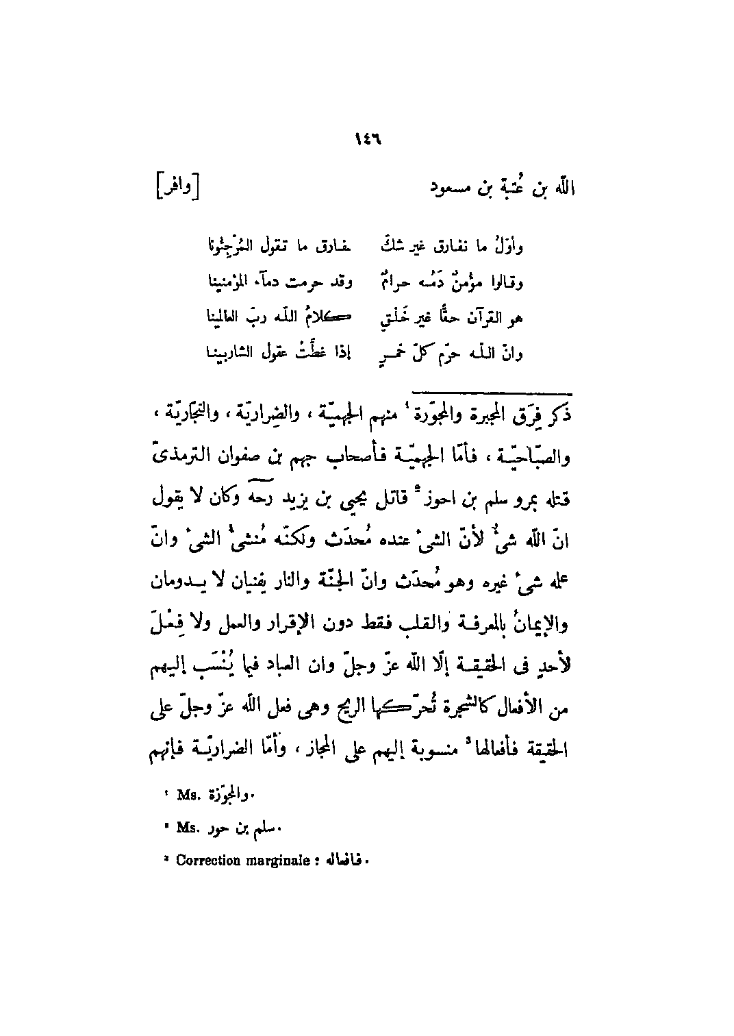 منهم الجهمية، والضرارية، والنجارية، والصباحية، فأما الجهمية فأصحاب جهم بن صفوان الترمذي قتله بمرو سلم بن أحوز [2] قاتل يحيى بن يزيد رحمه الله وكان لا يقول إن الله شيء لأن الشيء عنده محدث ولكنه منشئ الشيء وإن علمه شيء غيره وهو محدث وإن الجنة والنار يفنيان لا يدومان والإيمان بالمعرفة والقلب فقط دون الإقرار والعمل ولا فعل لأحد في الحقيقة إلا الله عز وجل وإن العباد فيما ينسب إليهم من الأفعال كالشجرة تحركها الريح وهي فعل الله عز وجل على الحقيقة فأفعالها [3] منسوبة إليهم على المجاز، وأما الضراريّة فإنّهم