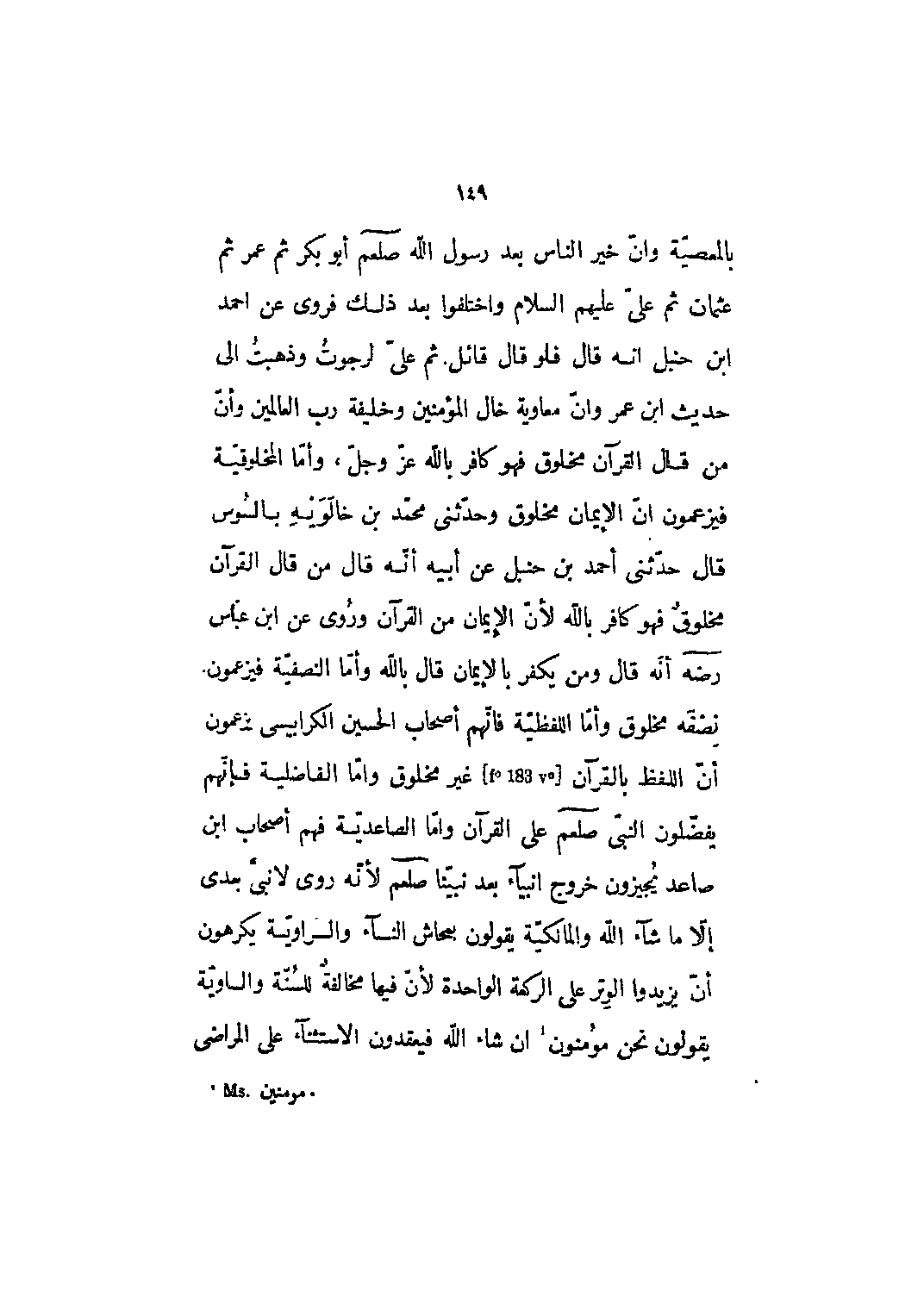 بالمعصية وإن خير الناس بعد رسول الله صلى الله عليه وسلم أبو بكر ثم عمر ثم عثمان ثم علي عليهم السلام واختلفوا بعد ذلك فروى عن احمد ابن حنبل انه قال فلو قال قائل. ثم علي لرجوت وذهبت إلى حديث ابن عمر وأن معاوية خال المؤمنين وخليفة رب العالمين وأن من قال القرآن مخلوق فهو كافر باللَّه عز وجل، وأما المخلوقية فيزعمون أن الإيمان مخلوق وحدثني محمد بن خالويه بالسوس قال حدثني أحمد بن حنبل عن أبيه أنه قال من قال القرآن مخلوق فهو كافر باللَّه لأن الإيمان من القرآن وروي عن ابن عباس رضي الله عنه أنه قال ومن يكفر بالإيمان قال باللَّه وأما النصفيّة فيزعمون نصفه مخلوق وأمّا اللفظية فإنهم أصحاب الحسين الكرابيسي يزعمون أن اللفظ بالقرآن [F؟ 183 v؟] غير مخلوق وأما الفاضلية فإنهم يفضلون النبي صلى الله عليه وسلم على القرآن وأما الصاعدية فهم أصحاب ابن صاعد يجيزون خروج أنبياء بعد نبينا صلى الله عليه وسلم لأنه روي لا نبي بعدي إلا ما شاء الله والمالكية يقولون بمحاش النساء والسراوية يكرهون أن يزيدوا الوتر على الركعة الواحدة لأن فيها مخالفة للسنة والساوية يقولون نحن مؤمنون [1] إن شاء الله فيعقدون الاستثناء على المراضي