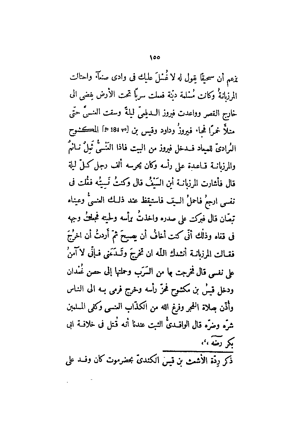 يزعم أن سحيقاً يقول له لا غسل عليك في وادي صنعاء واحتالت المرزبانة وكانت مسلمة دينة فعملت سرباً تحت الأرض يفضي إلى خارج القصر وواعدت فيروز الديلمي ليلةً وسقت العنسي حتى امتلأ خمراً فجاء فيروز وداود وقيس بن [F؟ 184 v؟] المكشوح المرادي للميعاد فدخل فيروز من البيت فإذا العنسي ثمل نائم والمرزبانة قاعدة على رأسه وكان يحرسه ألف رجلٍ كل ليلة قال فأشارت المرزبانة أين السيف قال وكنت نسيته فقلت في نفسي أرجع فأحمل السيف فاستيقظ عند ذلك العنسي وعيناه تبصان قال فبركت على صدره وأخذت برأسه ولحيته فجعلت وجهه في قفاه وذلك أني كنت أخاف أن يصيح ثم أردت أن أخرج فقالت المرزبانة أنشدك الله أن تخرج وتدعني فإني لا آمن على نفسي قال فخرجت بها من السرب وحملتها إلى حصن غمدان ودخل قيس بن مكشوح فحز رأسه وخرج فرمى به إلى الناس وأذن بصلاة الفجر وفرغ الله من الكذاب العنسي وكفى المسلمين شره وضره قال الواقدي الثبت عندنا أنه قتل في خلافة أبي بكر رضي الله عنه،،،