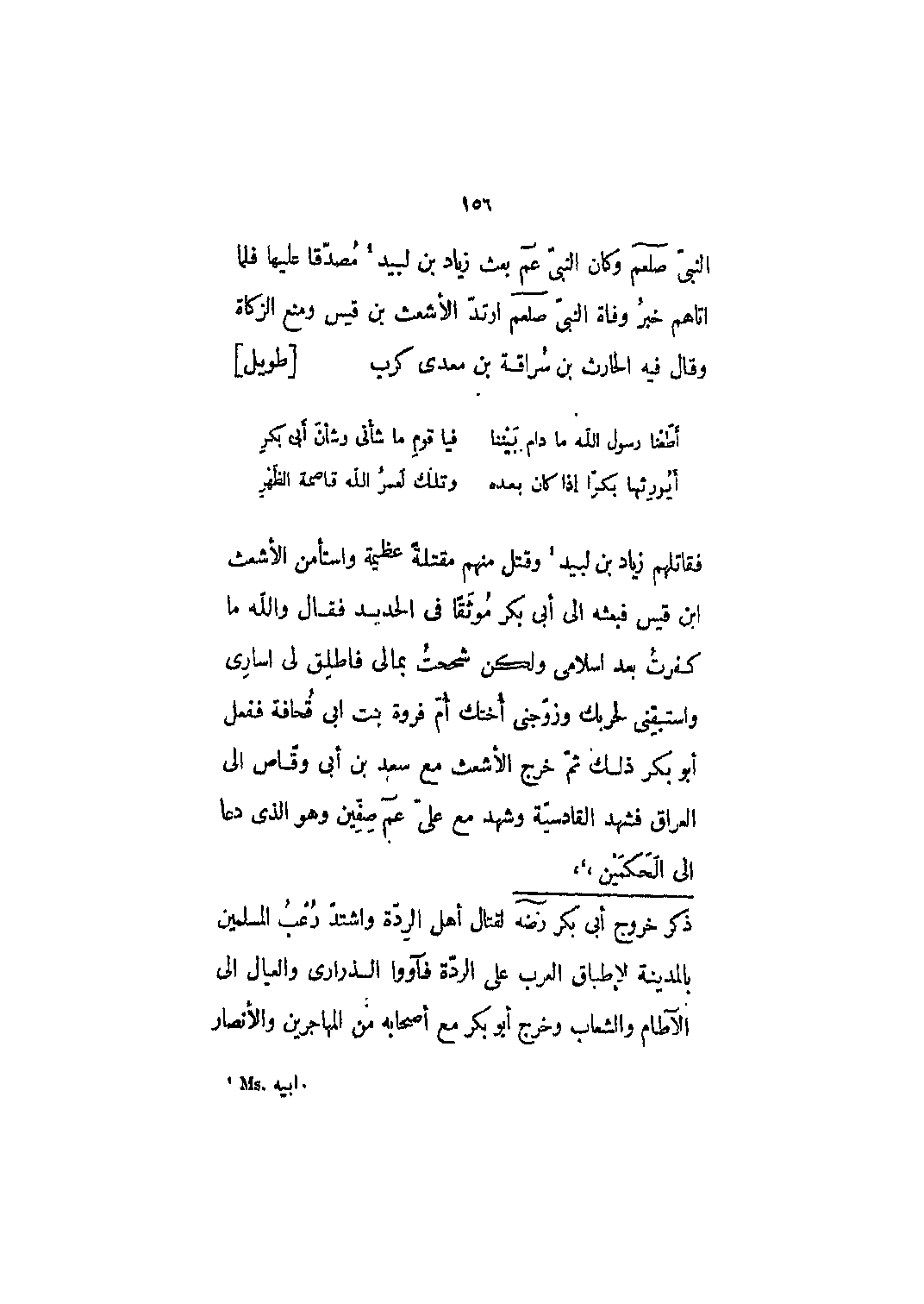 فقاتلهم زياد بن لبيد [1] وقتل منهم مقتلةً عظيمةً واستأمن الأشعث ابن قيس فبعثه إلى أبي بكر موثقاً في الحديد فقال والله ما كفرت بعد إسلامي ولكن شححت بمالي فأطلق لي إساري واستبقني لحربك وزوجني أختك أم فروة بنت أبي قحافة ففعل أبو بكر ذلك ثم خرج الأشعث مع سعد بن أبي وقاص إلى العراق فشهد القادسيّة وشهد مع عليّ عم صفين وهو الذي دعا إلى الحكمين،،،
