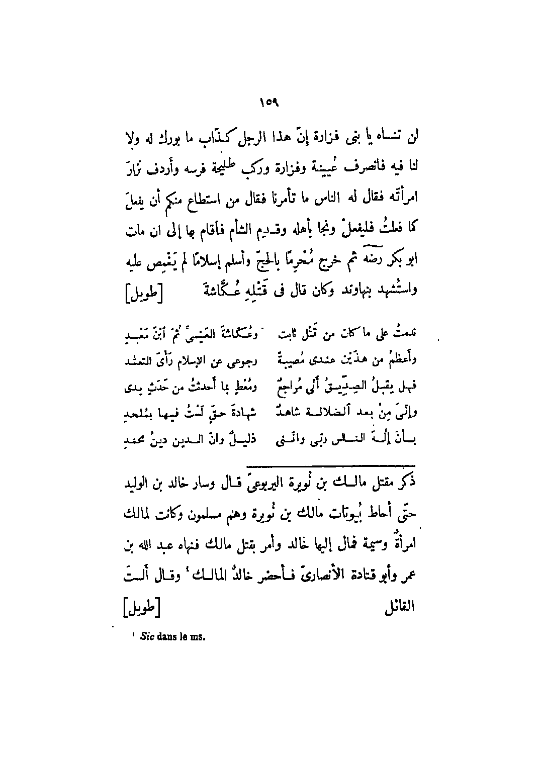 قال وسار خالد بن الوليد حتى أحاط بيوتات مالك بن نويرة وهم مسلمون وكانت لمالك امرأة وسيمة فمال إليها خالد وأمر بقتل مالك فنهاه عبد الله بن عمر وأبو قتادة الأنصاري فأحضر خالد المالك [1] وقال ألست القائل [طويل]