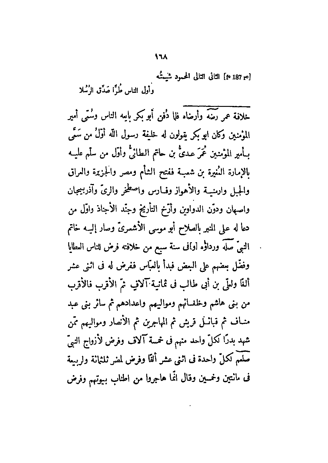 فلما دفن أبو بكر بايعه الناس وسمّى أمير المؤمنين وكان ابو بكر يقولون له خليفة رسول الله أول من سمي بأمير المؤمنين عمر عدي بن حاتم الطائي وأول من سلم عليه بالإمارة المغيرة بن شعبة ففتح الشام ومصر والجزيرة والعراق والجبل وارمنية والأهواز وفارس واصطخر والري وأذربيجان وأصبهان ودون الدواوين وأرخ التأريخ وجند الأجناد وأول من دعا له على المنبر بالصلاح أبو موسى الأشعري وصار إليه خاتم النبي صله ورداؤه [و] في سنة سبع من خلافته فرض للناس العطايا وفضل بعضهم على البعض فبدأ بالعباس ففرض له في اثني عشر ألفاً ولعلي بن أبي طالب في ثمانية آلاف ثم الأقرب فالأقرب من بني هاشم وخلفائهم ومواليهم وأعدادهم ثم سائر بني عبد مناف ثم قبائل قريش ثم المهاجرين ثم الأنصار ومواليهم ممن شهد بدرا لكلّ واحد منهم في خمسة آلاف وفرض لأزواج النبي صلى الله عليه وسلم لكل واحدة في اثنى عشر ألفاً وفرض لمضر ثلاثمائة ولربيعة في مائتين وخمسين وقال إنما هاجروا من أطناب بيوتهم وفرض