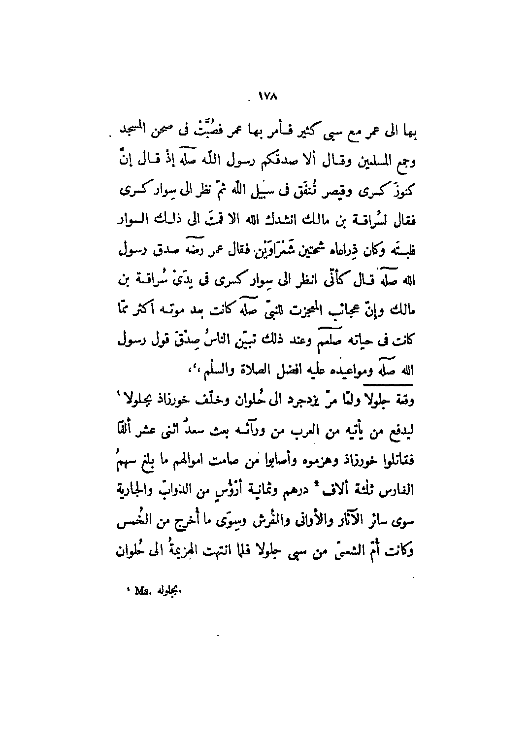 بها إلى عمر مع سبى كثير فأمر بها عمر فصبت في صحن المسجد وجمع المسلمين وقال ألا صدقكم رسول الله صله إذ قال إن كنوز كسرى وقيصر تنفق في سبيل الله ثم نظر إلى سوار كسرى فقال لسراقة بن مالك أنشدك الله ألا قمت إلى ذلك السوار فلبسته وكان ذراعاه شحتين شعراوين فقال عمر رضي الله عنه صدق رسول الله صله قال كأني أنظر إلى سوار كسرى في يدي سراقة بن مالك وإن عجائب المعجزات للنبي صله كانت بعد موته أكثر ممّا كانت في حياته صلى الله عليه وسلم وعند ذلك تبيّن الناس صدق قول رسول الله صله ومواعيده عليه أفضل الصلاة وأسلم،،،