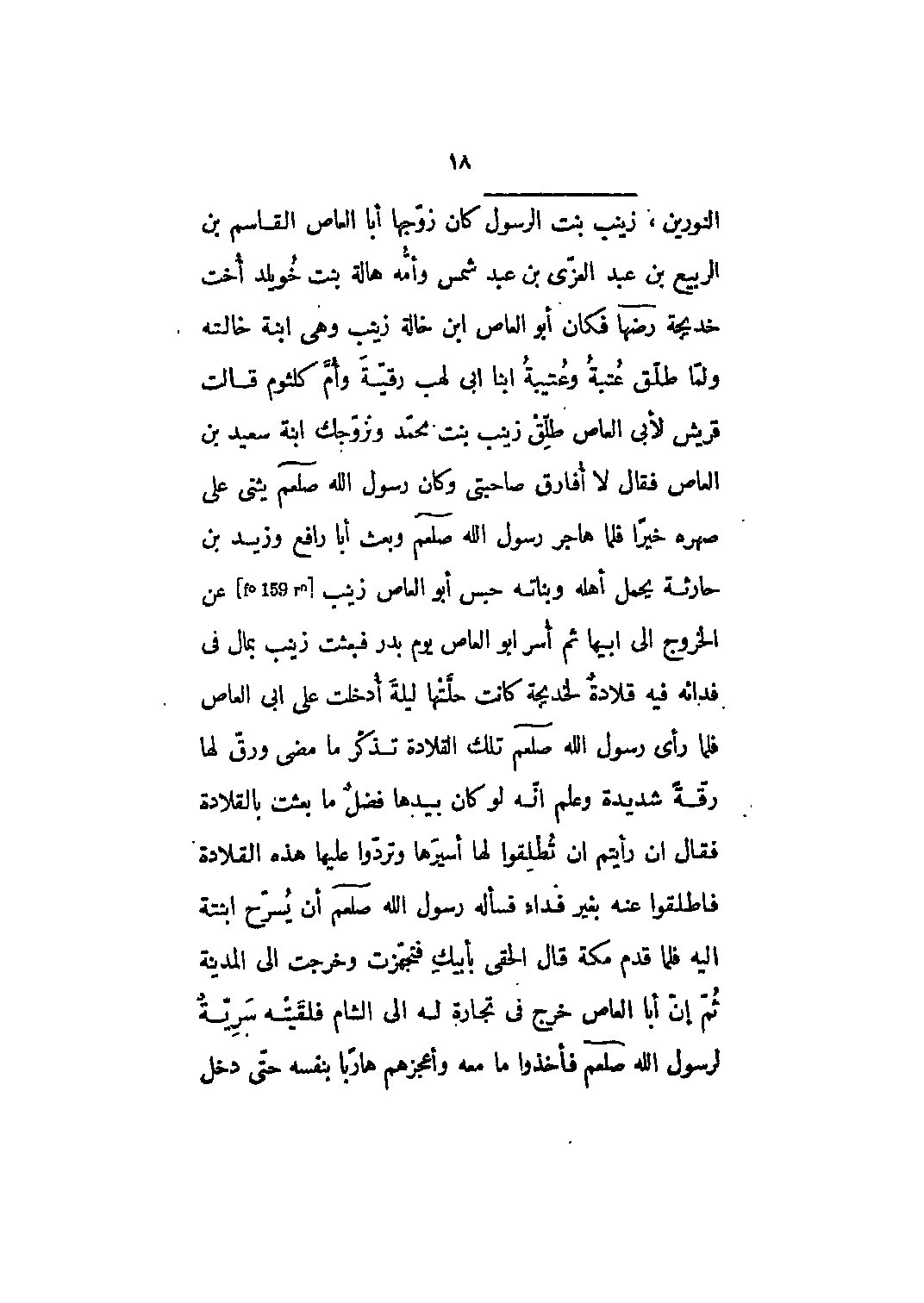 كان زوجها أبا العاص القاسم بن الربيع بن عبد العزى بن عبد شمس وأمه هالة بنت خويلد أخت خديجة رضي الله عنها فكان أبو العاص ابن خالة زينب وهي ابنة خالته ولما طلق عتبة وعتيبة ابنا أبي لهب رقية وأم كلثوم قالت قريش لأبي العاص طلق زينب بنت محمد ونزوجك ابنة سعيد بن العاص فقال لا أفارق صاحبتي وكان رسول الله صلى الله عليه وسلم يثني على صهره خيراً فلما هاجر رسول الله صلى الله عليه وسلم وبعث أبا رافع وزيد بن حارثة يحمل أهله وبناته حبس أبو العاص زينب [F؟ 159 r؟] عن الخروج إلى أبيها ثم أسر أبو العاص يوم بدر فبعثت زينب بمال في فدائه فيه قلادة لخديجة كانت حلتها ليلة أدخلت على أبي العاص فلما رأى رسول الله صلى الله عليه وسلم تلك القلادة تذكر ما مضى ورق لها رقّة شديدة وعلم انّه لو كان بيدها فضل ما بعثت بالقلادة فقال إن رأيتم أن تطلقوا لها أسيرها وتردوا عليها هذه القلادة فأطلقوا عنه بغير فداءٍ فسأله رسول الله صلى الله عليه وسلم أن يسرح ابنته إليه فلما قدم مكة قال الحقي بأبيك فتجهزت وخرجت إلى المدينة ثم إن أبا العاص خرج في تجارة له الى الشام فلقيته سرية لرسول الله صلى الله عليه وسلم فأخذوا ما معه وأعجزهم هاربا بنفسه حتى دخل