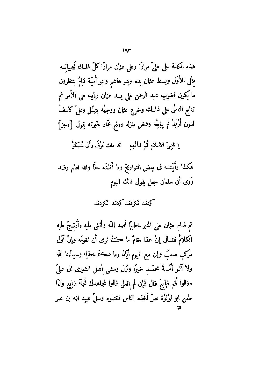 هكذا رأيته في بعض التواريخ وما أظنه حقاً والله أعلم وقد روي أن سلمان جعل يقول ذلك اليوم كردند نكردند كردند نكردند ثم قام عثمان على المنبر خطيباً فحمد الله وأثنى عليه وأرتج عليه الكلام فقال إن هذا مقام ما كنا نرى أن نقومه وإن أول مركب صعب وإن مع اليوم أياماً وما كنا خطباءْ وسيعلمنا الله ولا آلو أمة محمد خيراً ونزل ومشى أهل الشورى إلى علي وقالوا قم فبايع قال فإن لم أفعل قالوا نجاهدك فجاء فبايع ولما طعن أبو لؤلؤة عمر أخذه الناس فقتلوه وسل عبيد الله بن عمر