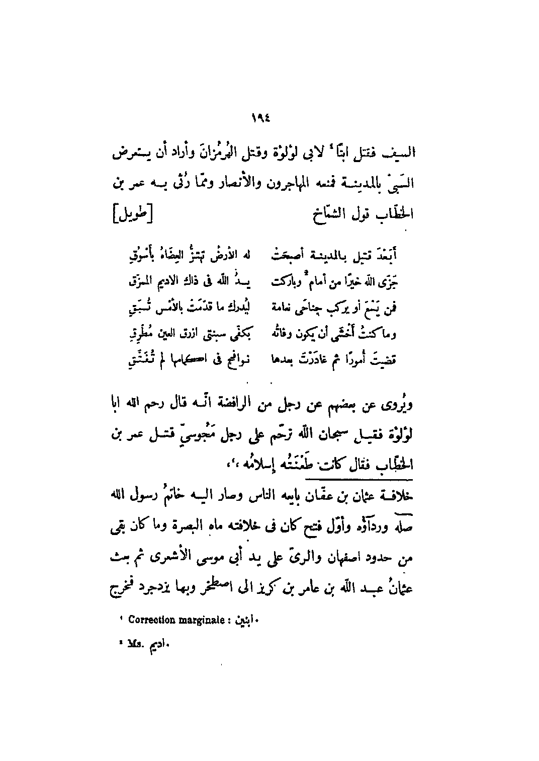 السيف فقتل ابناً [1] لأبي لؤلؤة وقتل الهرمزان وأراد أن يستعرض السبي بالمدينة فمنعه المهاجرون والأنصار ومما رثى به عمر بن الخطاب قول الشمّاخ [طويل]