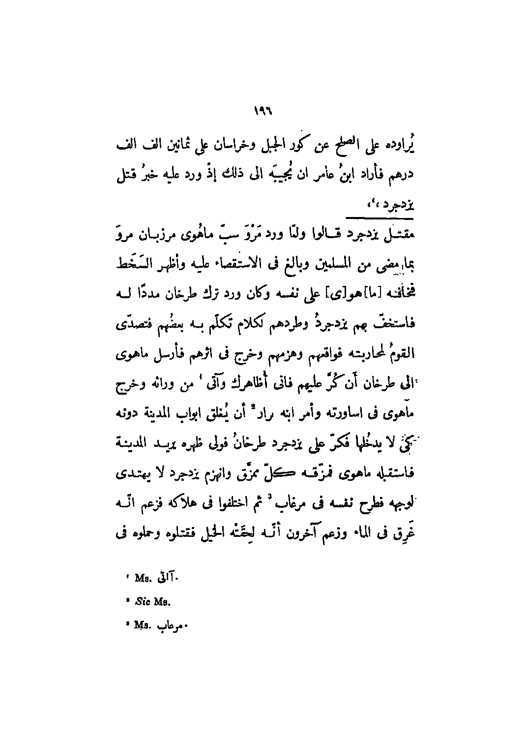 قالوا ولما ورد مرو سب ماهوى مرزبان مرو بما مضى من المسلمين وبالغ في الاستقصاء عليه وأظهر السخط فخافه [ما] هو [ى] على نفسه وكان ورد ترك طرخان مدداً له فاستخف بهم يزدجرد وطردهم لكلام تكلم به بعضهم فتصدى القوم لمحاربته فواقعهم وهزمهم وخرج في أثرهم فأرسل ماهوى إلى طرخان أن كر عليهم فإني أظاهرك وآتى [1] من ورائه وخرج ماهوى في أساورته وأمر ابنه؟ برار [2] أن يغلق أبواب المدينة دونه كي لا يدخلها فكر على يزدجرد طرخان فولى ظهره يريد المدينة فاستقبله ماهوى فمزقه كل ممزق وانهزم يزدجرد لا يهتدي لوجهه فطرح نفسه في مرغاب [3] ثم اختلفوا في هلاكه فزعم انّه عرق في الماء وزعم آخرون أنه لحقته الخيل فقتلوه وحملوه في