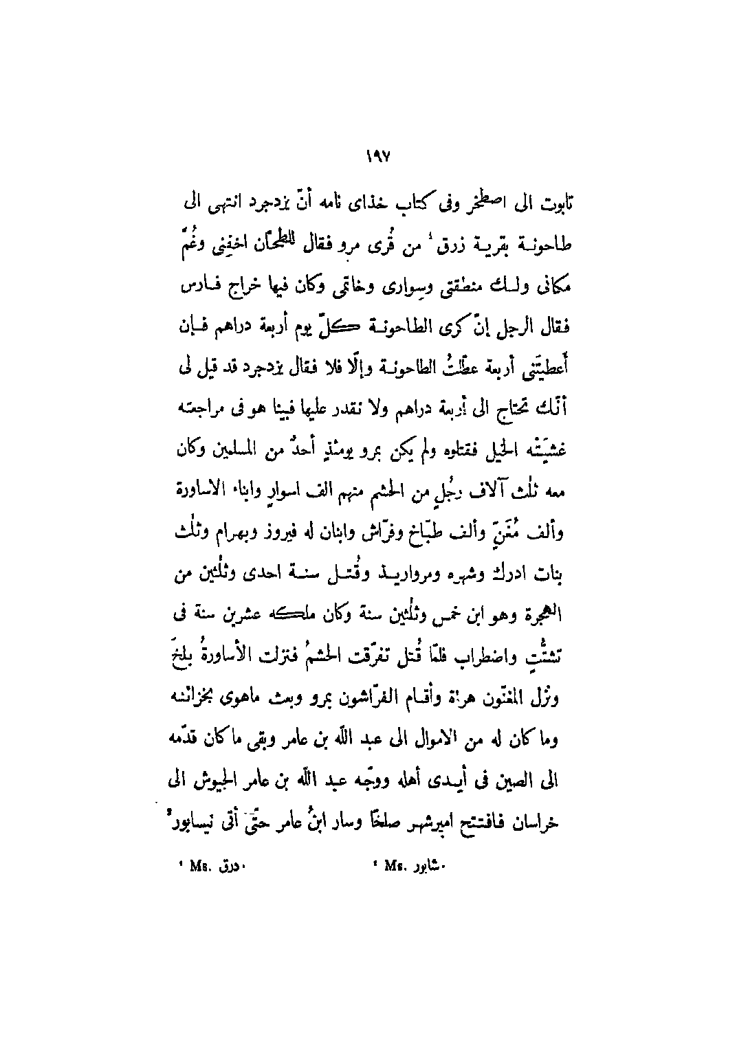 تابوت إلى أصطخر وفي كتاب خذاي نامه أن يزدجرد انتهى إلى طاحونة بقرية زرق [1] من قرى مرو فقال للطحان أخفني وغم مكاني ولك منطقتي وسواري وخاتمي وكان فيها خراج فارس فقال الرجل إن كرى الطاحونة كل يوم أربعة دراهم فإن أعطيتني أربعة عطّلت الطاحونة وإلّا فلا فقال يزدجرد قد قيل لي أنّك تحتاج الى أربعة دراهم ولا نقدر عليها فبينا هو في مراجعته غشيته الخيل فقتلوه ولم يكن بمرو يومئذ أحد من المسلمين وكان معه ثلث آلاف رجل من الحشم منهم ألف أسوار وأبناء الأساورة وألف مغنٍ وألف طباخ وفراش وابنان له فيروز وبهرام وثلث بنات أدرك وشهره ومرواريذ وقتل سنة إحدى وثلاثين من الهجرة وهو ابن خمس وثلاثين سنة وكان ملكه عشرين سنة في تشتت واضطراب فلما قتل تفرقت الحشم فنزلت الأساورة بلخ ونزل المغنون هراة وأقام الفراشون بمرو وبعث ماهوى بخزائنه وما كان له من الأموال إلى عبد الله بن عامر وبقي ما كان قدمه إلى الصين في أيدي أهله ووجه عبد الله بن عامر الجيوش إلى خراسان فافتتح أمير شهر صلحاً وسار ابن عامر حتى أتى نيسابور [2]