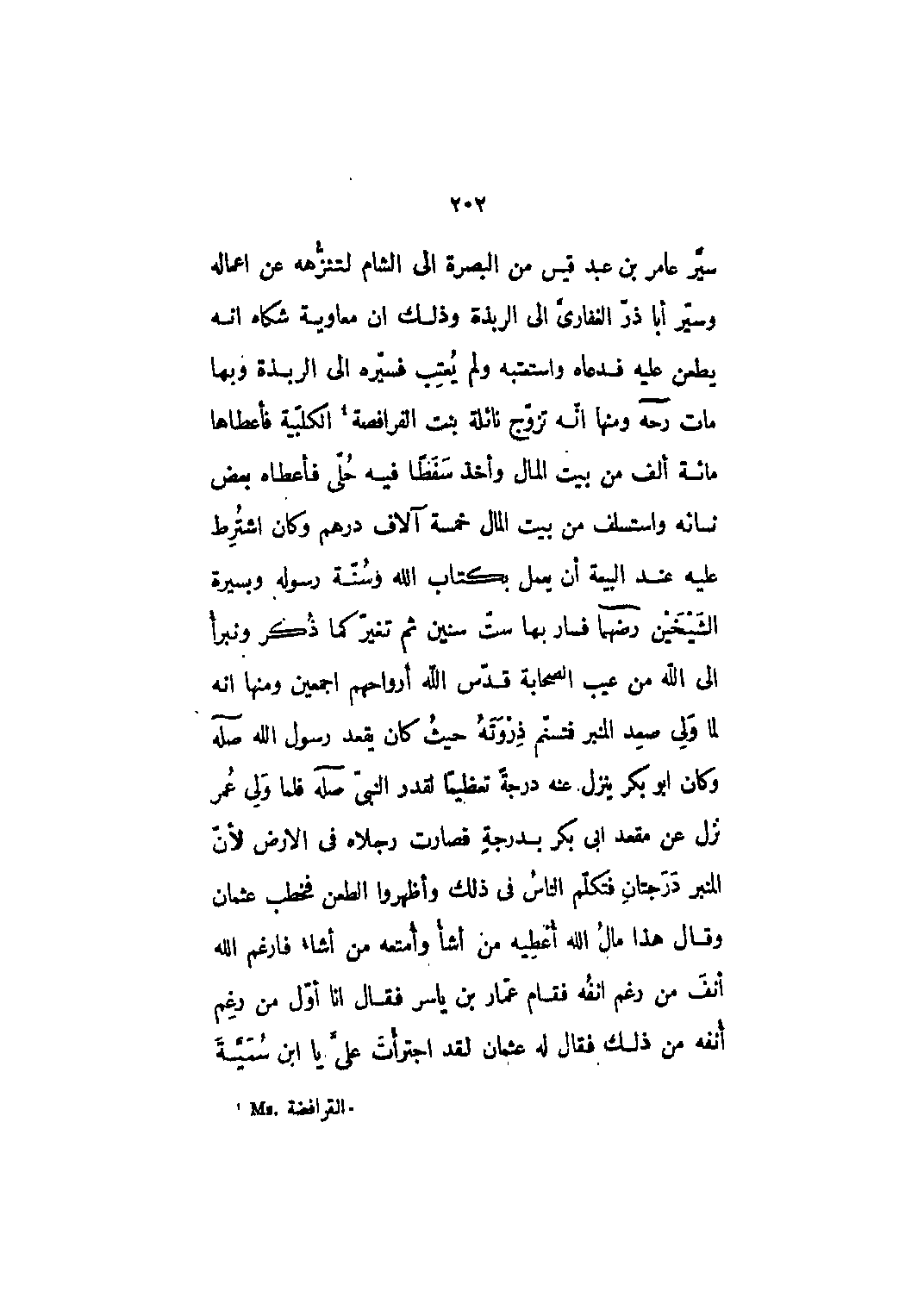 سيّر عامر بن عبد قيس من البصرة إلى الشام لتنزهه عن أعماله وسير أبا ذر الغفاري إلى الرَّبَذَة وذلك أن معاوية شكاه أنه يطعن عليه فدعاه واستعتبه ولم يعتب فسيره إلى الرَّبَذَة وبها مات رحمه الله ومنها أنه تزوج نائلة بنت الفرافصة [1] الكلبية فأعطاها مائة ألف من بيت المال وأخذ سفطاً فيه حلي فأعطاه بعض نسائه واستسلف من بيت المال خمسة آلاف درهم وكان اشترط عليه عند البيعة أن يعمل بكتاب الله وسنة رسوله وبسيرة الشيخين رضي الله عنهما فسار بها ست سنين ثم تغير كما ذكر ونبرأ إلى الله من عيب الصحابة قدس الله أرواحهم أجمعين ومنها أنه لما ولي صعد المنبر فتسنّم ذروته حيث كان يقعد رسول الله صله وكان أبو بكر ينزل عنه درجة تعظيما لقدر النبي صله فلما ولي عمر نزل عن مقعد أبي بكر بدرجة فصارت رجلاه في الأرض لأن المنبر درجتان فتكلم الناس في ذلك وأظهروا الطعن فخطب عثمان وقال هذا مال الله أعطيه من أشاء وأمتعه من أشاء فأرغم الله أنف من رغم أنفه فقام عمار بن ياسر فقال أنا أول من رغم أنفه من ذلك فقال له عثمان لقد اجترأت عليّ يا ابن سميّة
