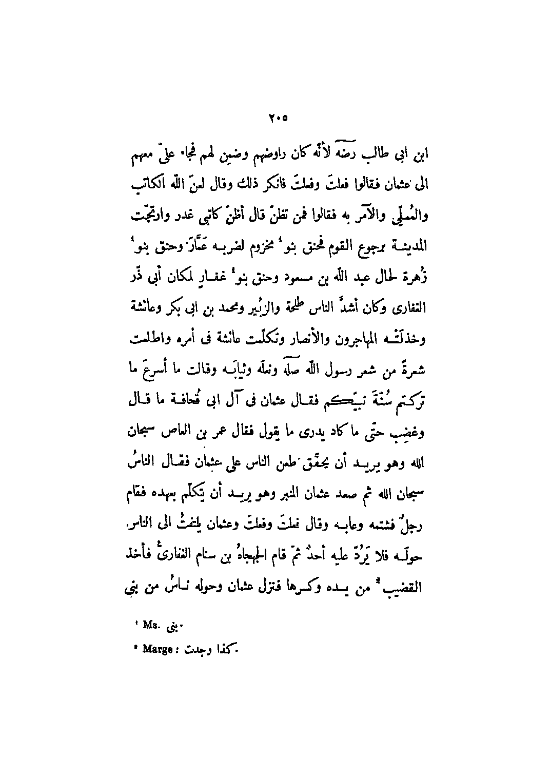 ابن أبي طالب رضي الله عنه لأنه كان راوضهم وضمن لهم فجاء علي معهم إلى عثمان فقالوا فعلت وفعلت فأنكر ذلك وقال لعن الله الكاتب والمملي والآمر به فقالوا فمن تظن قال أظن كاتبي غدر وارتجت المدينة برجوع القوم فحنق بنو [1] مخزوم لضربه عمار وحنق بنو [1] زهرة لحال عبد الله بن مسعود وحنق بنو [1] غفار لمكان أبي ذر الغفاري وكان أشد الناس طلحة والزبير ومحمد بن أبي بكر وعائشة وخذلته المهاجرون والأنصار وتكلمت عائشة في أمره واطلعت شعرة من شعر رسول الله صله ونعله وثيابه وقالت ما أسرع ما تركتم سنة نبيكم فقال عثمان في آل أبي قحافة ما قال وغضب حتى ما كاد يدري ما يقول فقال عمر بن العاص سبحان الله وهو يريد أن يحقق طعن الناس على عثمان فقال الناس سبحان الله ثم صعد عثمان المنبر وهو يريد أن يتكلم بعهده فقام رجل فشتمه وعابه وقال فعلت وفعلت وعثمان يلتفت إلى الناس حوله فلا يرد عليه أحد ثم قام الجهجاه بن سنام الغفاري فأخذ القضيب [2] من يده وكسرها فنزل عثمان وحوله ناس من بنى