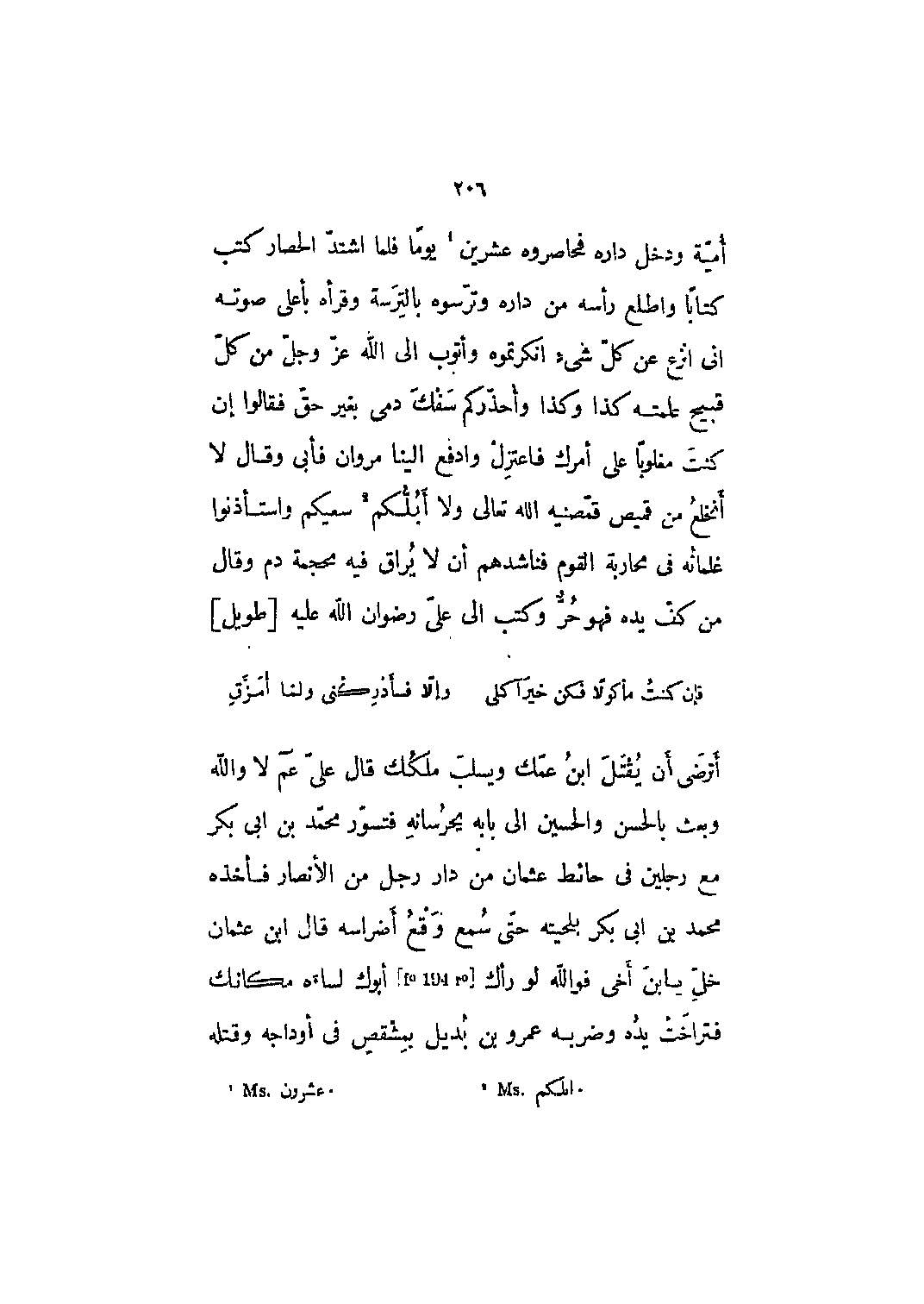 أمية ودخل داره فحاصروه عشرين [1] يوماً فلما اشتد الحصار كتب كتاباً وأطلع رأسه من داره وترسوه بالترسة وقرأه بأعلى صوته إني أنزع عن كل شيءٍ أنكرتموه وأتوب إلى الله عزّ وجلّ من كلّ قبيح عملته كذا وكذا وأحذركم سفك دمي بغير حق فقالوا إن كنت مغلوباً على أمرك فاعتزل وادفع إلينا مروان فأبى وقال لا أنخلع من قميص قمصنيه الله تعالى ولا أبلكم [2] سعيكم واستأذنوا غلمانه في محاربة القوم فناشدهم أن لا يراق فيه محجمة دم وقال من كف يده فهو حر وكتب إلى عليّ رضوان الله عليه [طويل]