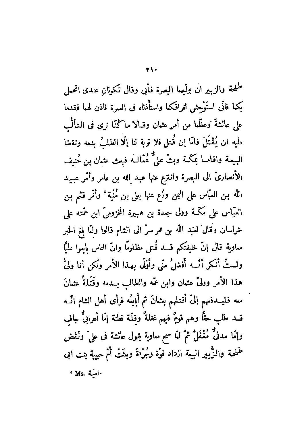 طلحة والزبير أن يوليهما البصرة فأبى وقال تكونان عندي أتحمل بكما فإني أستوحش لفراقكما وأستأذناه في العمرة فأذن لهما فقدما على عائشة وعظما من أمر عثمان وقالا ما كنا نرى في التألب عليه أن يقتل فامّا إن قتل فلا توبة لنا إلا الطلب بدمه ونقضا البيعة وأقاما بمكة وبث علي عماله فبعث عثمان بن حنيف الأنصاري إلى البصرة وانتزع عنها عبد الله بن عامر وأمر عبيد الله بن العباس على اليمن ونزع عنها يعلى بن منية [1] وأمر قثم بن العباس على مكة وولى جعدة بن هبيرة المخزومي ابن عمته على خراسان وقال لعبد الله بن عمر سر إلى الشام قالوا ولما بلغ الخبر معاوية قال إن خليفتكم قد قتل مظلوماً وأن الناس بايعوا علياً ولست أنكر أنه أفضل مني وأولى بهذا الأمر ولكن أنا ولي هذا الأمر وولي عثمان وابن عمه والطالب بدمه وقتله عثمان معه فليدفعهم إلي أقتلهم بعثمان ثم أبايعه فرأى أهل الشام أنه قد طلب حقاً وهم قوم فيهم غفلة وقلة فطنة إما أعرابي جاف وإما مدني مغفل ثم لما سمع معاوية بقول عائشة في علي ونقض طلحة والزبير البيعة ازداد قوة وجرأة وبعثت أم حبيبة بنت ابى