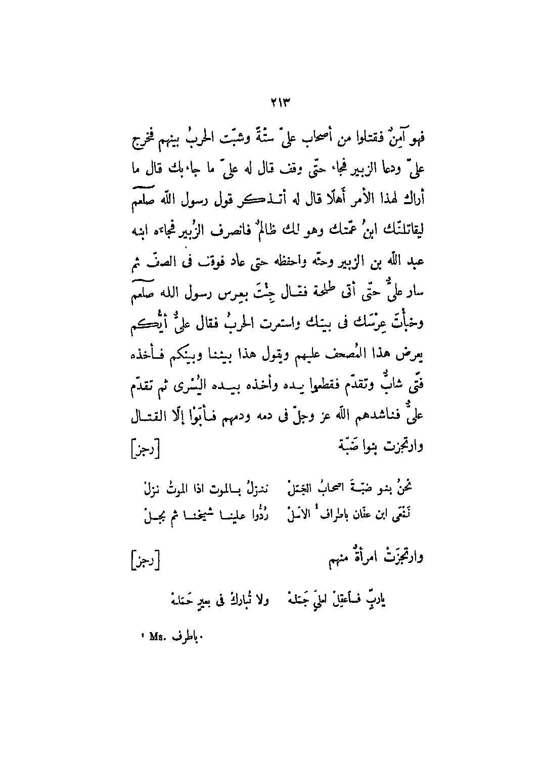فهو آمن فقتلوا من أصحاب علي ستة وشبت الحرب بينهم فخرج علي ودعا الزبير فجاء حتى وقف قال له علي ما جاء بك قال ما أراك لهذا الأمر أهلاً قال له أتذكر قول رسول الله صلى الله عليه وسلم ليقاتلنك ابن عمتك وهو لك ظالم فانصرف الزبير فجاءه ابنه عبد الله بن الزبير وحثه واحفظه حتى عاد فوقف في الصف ثم سار علي حتى أتى طلحة فقال جئت بعرس رسول الله صلى الله عليه وسلم وخبأت عرسك في بيتك واستعرت الحرب فقال علي أيكم يعرض هذا المصحف عليهم ويقول هذا بيننا وبينكم فأخذه فتى شاب وتقدم فقطعوا يده وأخذه بيده اليسرى ثم تقدم علي فناشدهم الله عز وجلّ في دمه ودمهم فأبوا إلّا القتال وارتجزت بنوا ضبّة [رجز]