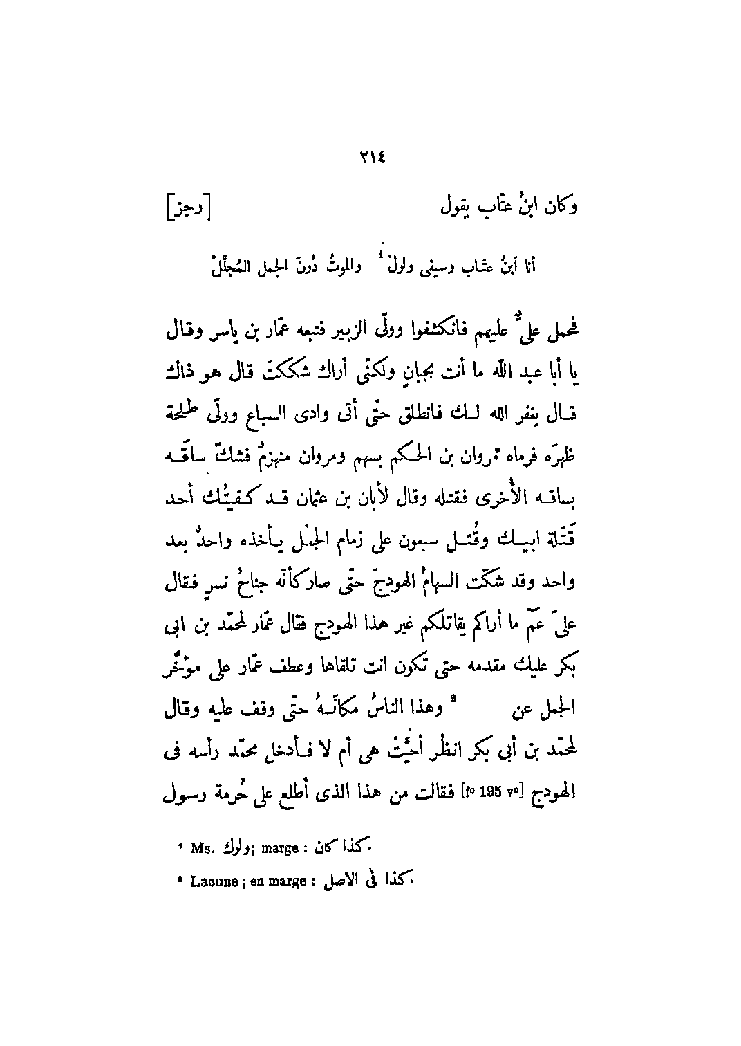 فحمل علي عليهم فانكشفوا وولى الزبير فتبعه عمار بن ياسر وقال يا أبا عبد الله ما أنت بجبان ولكني أراك شككت قال هو ذاك قال يغفر الله لك فانطلق حتى أتى وادي السباع وولى طلحة ظهره فرماه مروان بن الحكم بسهم ومروان منهزم فشك ساقه بساقه الأخرى فقتله وقال لأبان بن عثمان قد كفيتك أحد قتلة أبيك وقتل سبعون على زمام الجمل يأخذه واحد بعد واحد وقد شكت السهام الهودج حتى صار كأنه جناح نسر فقال عليّ عم ما أراكم يقاتلكم غير هذا الهودج فقال عمار لمحمد بن أبي بكر عليك مقدمه حتى تكون أنت تلقاها وعطف عمار على مؤخّر الجمل عن [2] وهذا الناس مكانه حتى وقف عليه وقال لمحمّد بن أبى بكر انظر أحيّة هي أم لا فأدخل محمد رأسه في الهودج [F؟ 195 v؟] فقالت من هذا الذي أطلع على حرمة رسول