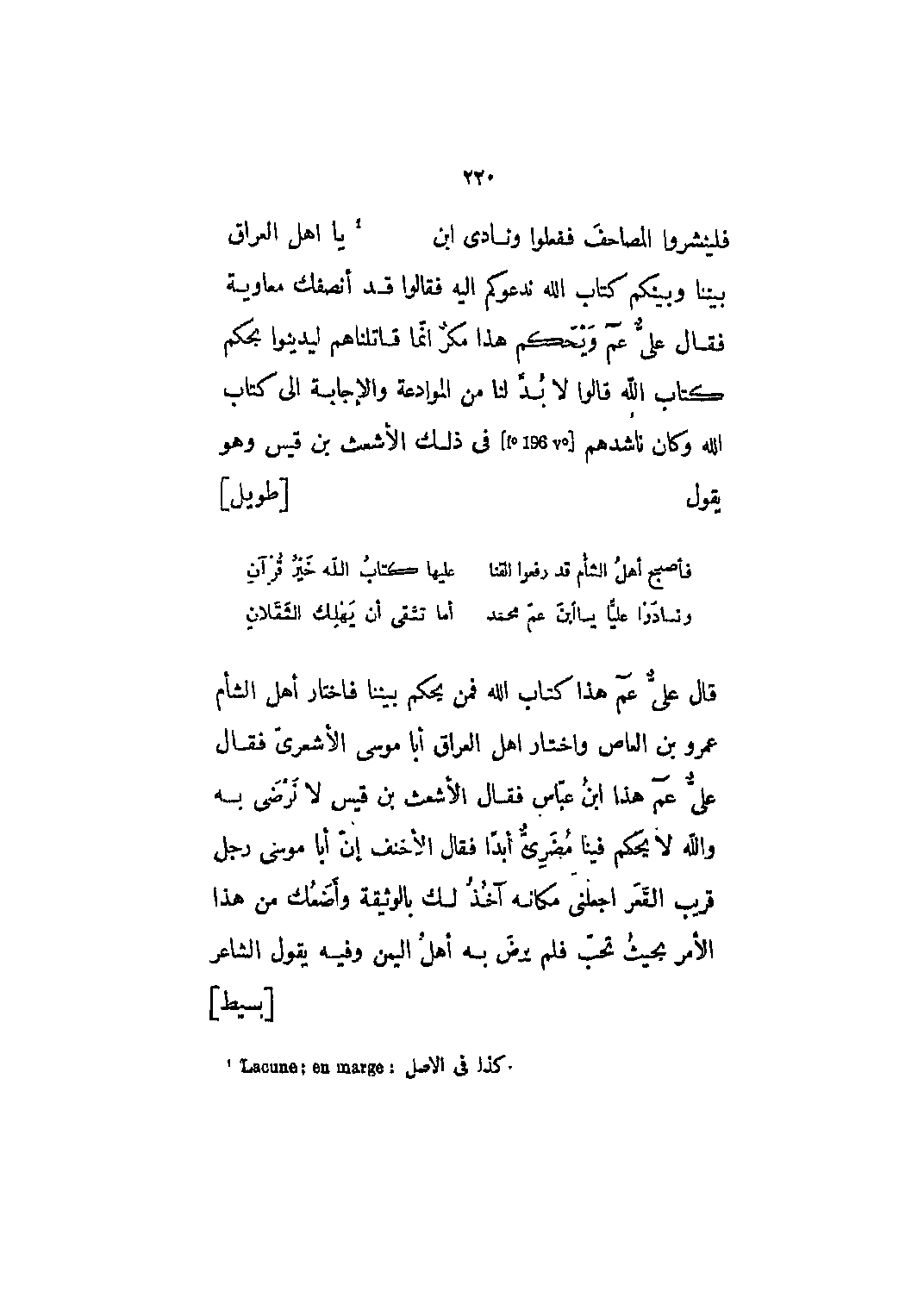 فلينشروا المصاحف ففعلوا ونادى ابن [1] يا أهل العراق بيننا وبينكم كتاب الله ندعوكم إليه فقالوا قد أنصفك معاوية فقال عليّ عم ويحكم هذا مكر انّما قاتلناهم ليدينوا بحكم كتاب الله قالوا لا بدّ لنا من الموادعة والإجابة إلى كتاب الله وكان ناشدهم [F؟ 196 v؟] في ذلك الأشعث بن قيس وهو يقول [طويل]