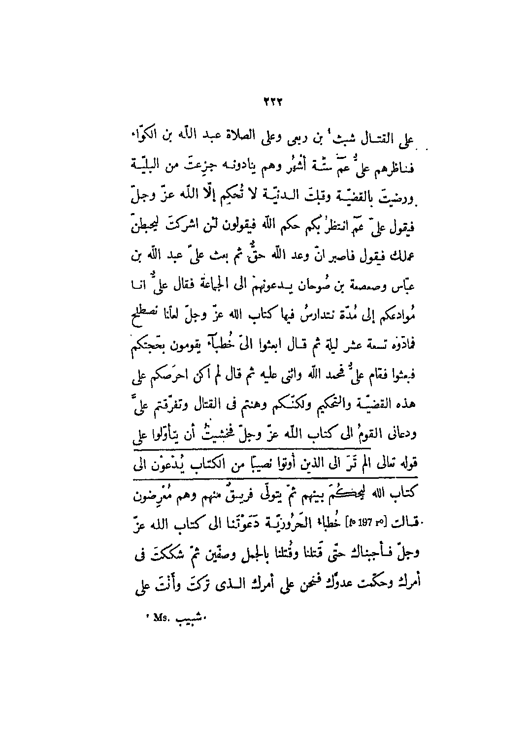 على القتال شبث [1] بن ربعى وعلى الصلاة عبد الله بن الكوّاء فناظرهم على عم ستة أشهر وهم ينادونه جزعت من البلية ورضيت بالقضية وقبلت الدنية لا تحكم إلا الله عزّ وجلّ فيقول على عم انتظر بكم حكم الله فيقولون لئن أشركت ليحبطن عملك فيقول فاصبر إن وعد الله حق ثم بعث علي عبد الله بن عباس وصعصعة بن صوحان يدعونهم إلى الجماعة فقال علي أنا موادعكم إلى مدة نتدارس فيها كتاب الله عز وجل لعلنا نصطلح فمادّوه تسعة عشر ليلة ثم قال ابعثوا إلى خطباء يقومون بحجتكم فبعثوا فقام علي فحمد الله وأثنى عليه ثم قال لم أكن أحرصكم على هذه القضية والتحكيم ولكنكم وهنتم في القتال وتفرقتم علي ودعاني القوم إلى كتاب الله عز وجل فخشيت أن يتأولوا على قوله تعالى أَلَمْ تَرَ إِلَى الَّذِينَ أُوتُوا نَصِيباً من الْكِتابِ يُدْعَوْنَ إِلى كِتابِ الله لِيَحْكُمَ بَيْنَهُمْ ثُمَّ يَتَوَلَّى فَرِيقٌ مِنْهُمْ وَهُمْ مُعْرِضُونَ 3: 23 قالت [F؟ 197 r؟] خطباء الحرورية دعوتنا إلى كتاب الله عزّ وجلّ فأجبناك حتّى قتلنا وقتلنا بالجمل وصفين ثم شككت في أمرك وحكّمت عدوّك فنحن على أمرك الّذي تركت وأنت على