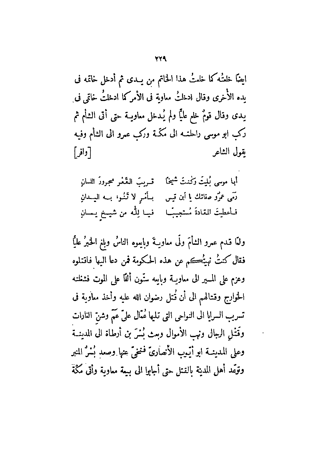 أيضا خلعته كما خلعت هذا الخاتم من يدي ثم أدخل خاتمه في يده الأخرى وقال أدخلت معاوية في الأمر كما أدخلت خاتمي في يدي وقال قوم خلع علياً ولم يدخل معاوية حتى أتى الشام ثم ركب أبو موسى راحلته إلى مكة وركب عمرو الى الشأم وفيه يقول الشاعر [وافر]