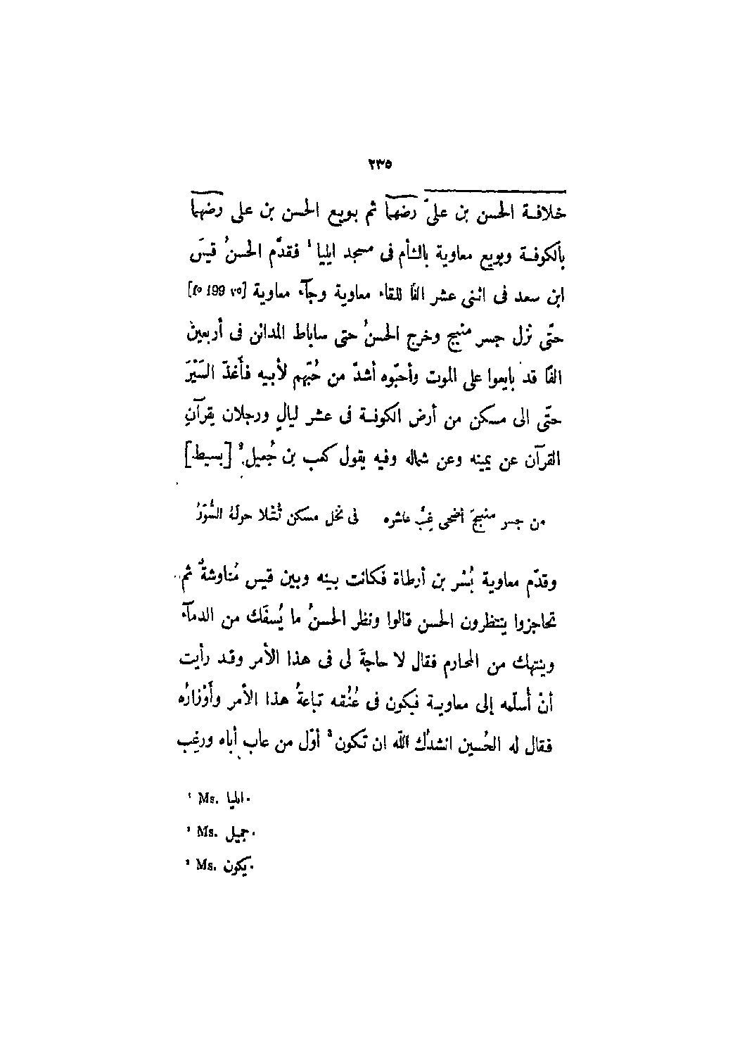 ثم بويع الحسن بن علي رضي الله عنهما بالكوفة وبويع معاوية بالشام في مسجد إيليا [1] فقدّم الحسن قيس ابن سعد في اثني عشر ألفاً للقاء معاوية وجاء معاوية [F؟ 199 v؟] حتى نزل جسر منبج وخرج الحسن حتى ساباط المدائن في أربعين ألفاً قد بايعوا على الموت وأحبوه أشد من حبهم لأبيه فأغذ السير حتى إلى مسكن من أرض الكوفة في عشر ليالٍ ورجلان يقرءان القرآن عن يمينه وعن شماله وفيه يقول كعب بن جعيل [2] [بسيط]