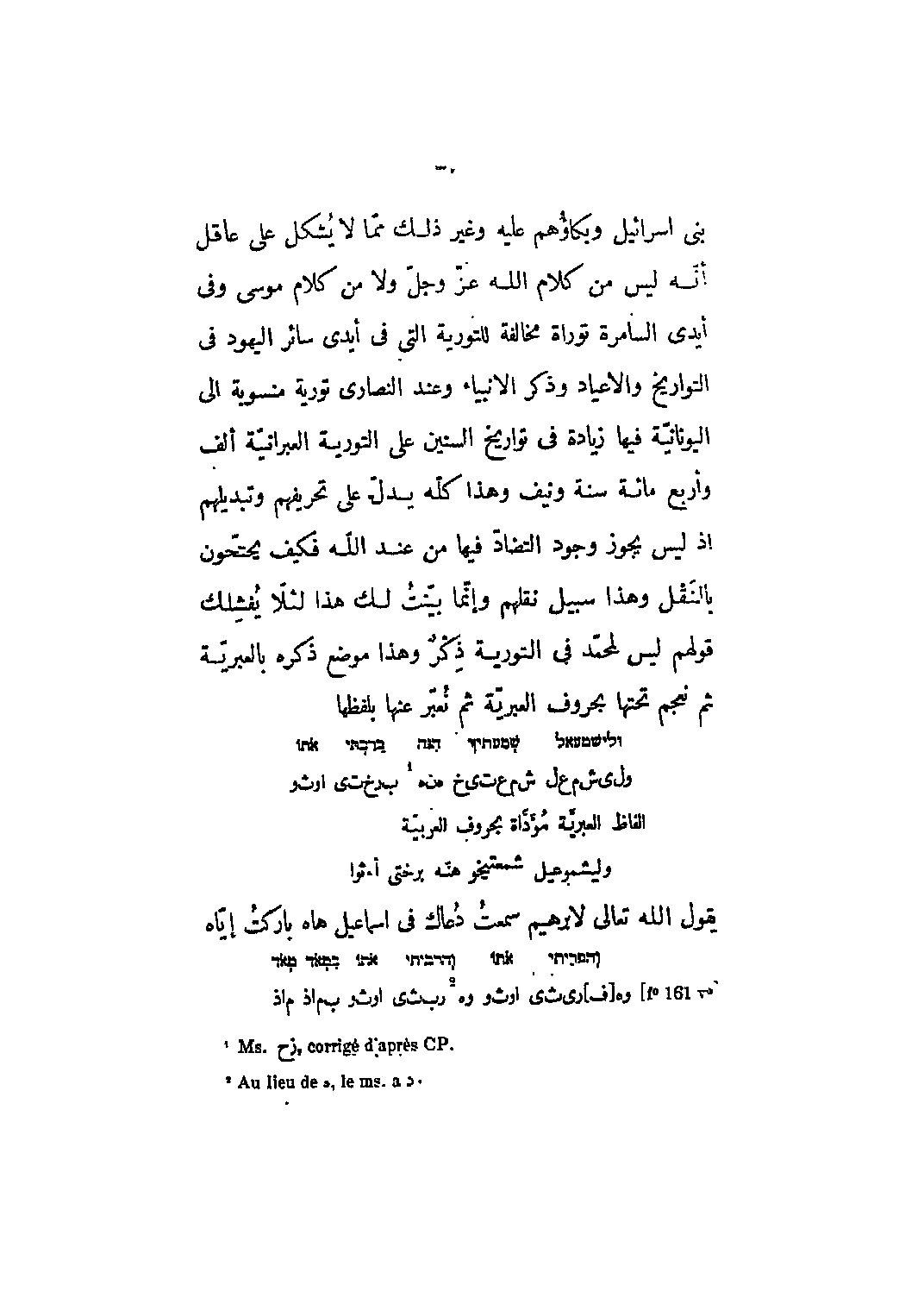 بني إسرائيل وبكاؤهم عليه وغير ذلك مما لا يشكل على عاقل أنه ليس من كلام الله عز وجل ولا من كلام موسى وفي أيدي السامرة توراة مخالفة للتورية التي في أيدي سائر اليهود في التواريخ والأعياد وذكر الأنبياء وعند النصارى تورية منسوبة إلى اليونانية فيها زيادة في تواريخ السنين على التوراة العبرانية ألف وأربع مائة سنة ونيف وهذا كله يدل على تحريفهم وتبديلهم إذ ليس يجوز وجود التضاد فيها من عند الله فكيف يحتّحون بالنقل وهذا سبيل نقلهم وإنما بينت لك هذا لئلّا يفشلك قولهم ليس لمحمّد في التوراة ذكر وهذا موضع ذكره بالعبرية ثم نعجم تحتها بحروف العبرية ثم نعبر عنها بلفظها [؟] ول ى ش م ع ل ش م ع ت ى خ هـ ن هـ[1] ب رخ ت ى اوث وألفاظ العبريّة مؤدّاة بحروف العربيّة وليشموعيل شمعتيخو هنّه برختى أءثوا يقول الله تعالى لإبراهيم سمعت دعاك في إسماعيل هاه باركت إيّاه [F؟ 161 V؟] وه [ف] رى ث ى اوث ووه [2] رب ث ى اوث وب م اذ م اذ