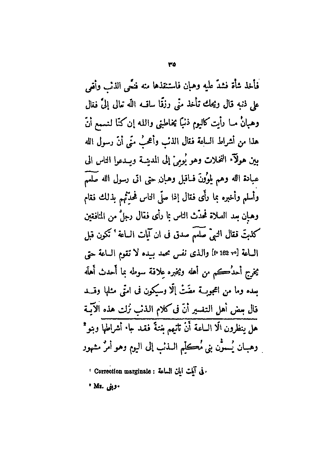 فأخذ شاةً فشد عليه وهبان فاستنقذها منه فنحى الذئب وأقعى على ذنبه قال ويحك تأخذ مني رزقاً ساقه الله تعالى إلي فقال وهبان ما رأيت كاليوم ذئباً يخاطبني والله إن كنا لنسمع أن هذا من أشراط الساعة فقال الذئب وأعجب مني أن رسول الله بين هؤلاء النخلات وهو يومئ إلى المدينة ويدعوا الناس إلى عبادة الله وهم يلوون فأقبل وهبان حتى أتي رسول الله صلى الله عليه وسلم وأسلم وأخبره بما رأى فقال إذا صلّى الناس فحدّثهم بذلك فقام وهبان بعد الصلاة فحدث الناس بما رأى فقال رجل من المنافقين كذبت فقال النبي صلى الله عليه وسلم صدق في أن آيات الساعة [1] تكون قبل الساعة [F؟ 162 v؟] والذي نفس محمد بيده لا تقوم الساعة حتى يخرج أحدكم من أهله ويخبره علاقة سوطه بما أحدث أهله بعده وما من أعجوبة مضت إلا وسيكون في أمتي مثلها وقد قال بعض أهل التفسير أن في كلام الذئب نزلت هذه الآية فَهَلْ يَنْظُرُونَ إِلَّا السَّاعَةَ أَنْ تَأْتِيَهُمْ بَغْتَةً فَقَدْ جاءَ أَشْراطُها 47: 18 وبنو [2] وهبان يسمون بني مكلم الذئب إلى اليوم وهو أمر مشهور