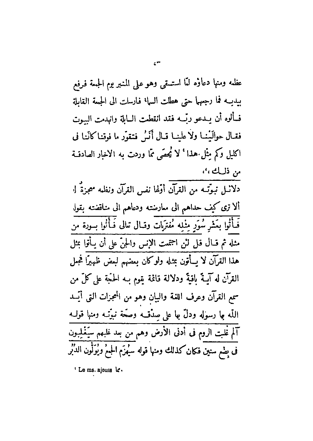 أولها نفس القرآن ونظمه معجزة له ألا ترى كيف حداهم إلى معارضته ودعاهم إلى مناقضته بقوله فَأْتُوا بِعَشْرِ سُوَرٍ مِثْلِهِ مُفْتَرَياتٍ 11: 13 وقال تعالى فَأْتُوا بِسُورَةٍ من مِثْلِهِ 2: 23 ثم قال قُلْ لَئِنِ اجْتَمَعَتِ الْإِنْسُ وَالْجِنُّ عَلى أَنْ يَأْتُوا بِمِثْلِ هذَا الْقُرْآنِ لا يَأْتُونَ بِمِثْلِهِ وَلَوْ كانَ بَعْضُهُمْ لِبَعْضٍ ظَهِيراً 17: 88 فجعل القرآن له آية باقية ودلالة قائمة يقوم به الحجة على كل من سمع القرآن وعرف اللغة والبيان وهو من المعجزات التي أيد الله بها رسوله ودل بها على صدقه وصحة نبوته ومنها قوله آلم غُلِبَتِ الرُّومُ في أَدْنَى الْأَرْضِ وَهُمْ من بَعْدِ غَلَبِهِمْ سَيَغْلِبُونَ في بِضْعِ سِنِينَ 30: 1- 4 فكان كذلك ومنها قوله سَيُهْزَمُ الْجَمْعُ وَيُوَلُّونَ الدُّبُرَ 54: 45