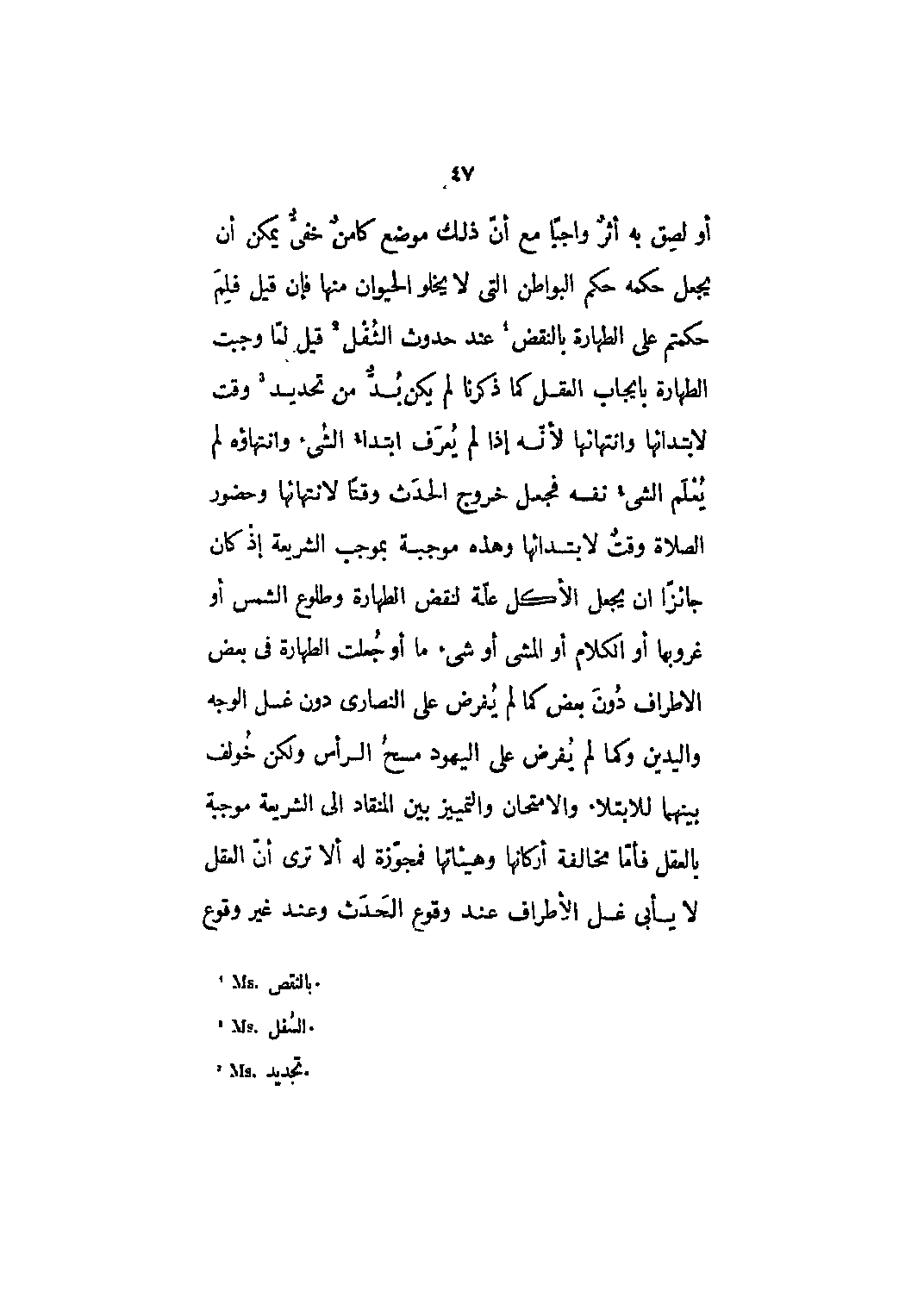أو لصق به أثر واجبا مع أن ذلك موضع كامن خفي يمكن أن يجعل حكمه حكم البواطن التي لا يخلو الحيوان منها فإن قيل فلم حكمتم على الطهارة بالنقض [1] عند حدوث الثفل [2] قيل لما وجبت الطهارة بإيجاب العقل كما ذكرنا لم يكن بد من تحديد [3] وقتٍ لابتدائها وانتهائها لأنه إذا لم يعرف ابتداء الشيء وانتهاؤه لم يعلم الشيء نفسه فجعل خروج الحدث وقتاً لانتهائها وحضور الصلاة وقت لابتدائها وهذه موجبة بموجب الشريعة إذا كان جائزاً أن يجعل الأكل علة لنقض الطهارة وطلوع الشمس أو غروبها أو الكلام أو المشي أو شيء ما أو جعلت الطهارة في بعض الأطراف دون بعض كما لم يفرض على النصارى دون غسل الوجه واليدين وكما لم يفرض على اليهود مسح الرأس ولكن خولف بينهما للابتلاء والامتحان والتمييز بين المنقاد إلى الشريعة موجبة بالعقل فأما مخالفة أركانها وهيئاتها فمجوزة له ألا ترى أن العقل لا يأبى غسل الأطراف عند وقوع الحدث وعند غير وقوع