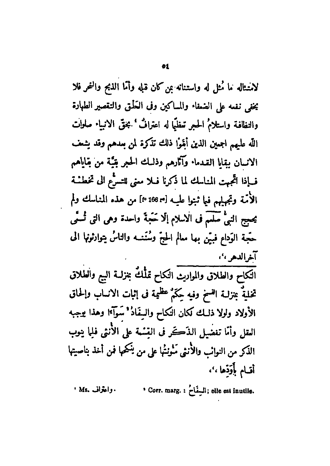 لامتثاله ما مثل له واستنانه بمن كان قبله وأما الذبح والنحر فلا يخفى نفعه على الضعفاء والمساكين وفي الحلق والتقصير الطهارة والنظافة واستلام الحجر تعظيما له اعتراف [1] بحق الأنبياء صلوات الله عليهم أجمعين الذين أبقوا ذلك تذكرة لمن بعدهم وقد يشعف الإنسان ببقايا القدماء وآثارهم وذلك الحجر بقية من بقاياهم فإذا اتجهت المناسك لما ذكرنا فلا معنى للتسرع إلى تخطئة الأمة وتجهيلهم فيما ثبتوا عليه [F؟ 166 r؟] من هذه المناسك ولم يحجج النبي صلى الله عليه وسلم في الإسلام إلا حجة واحدة وهي التي تسمى حجّة الوداع فبيّن بها معالم الحج وسننه والناس يتوارثونها إلى آخر الدهر،،،