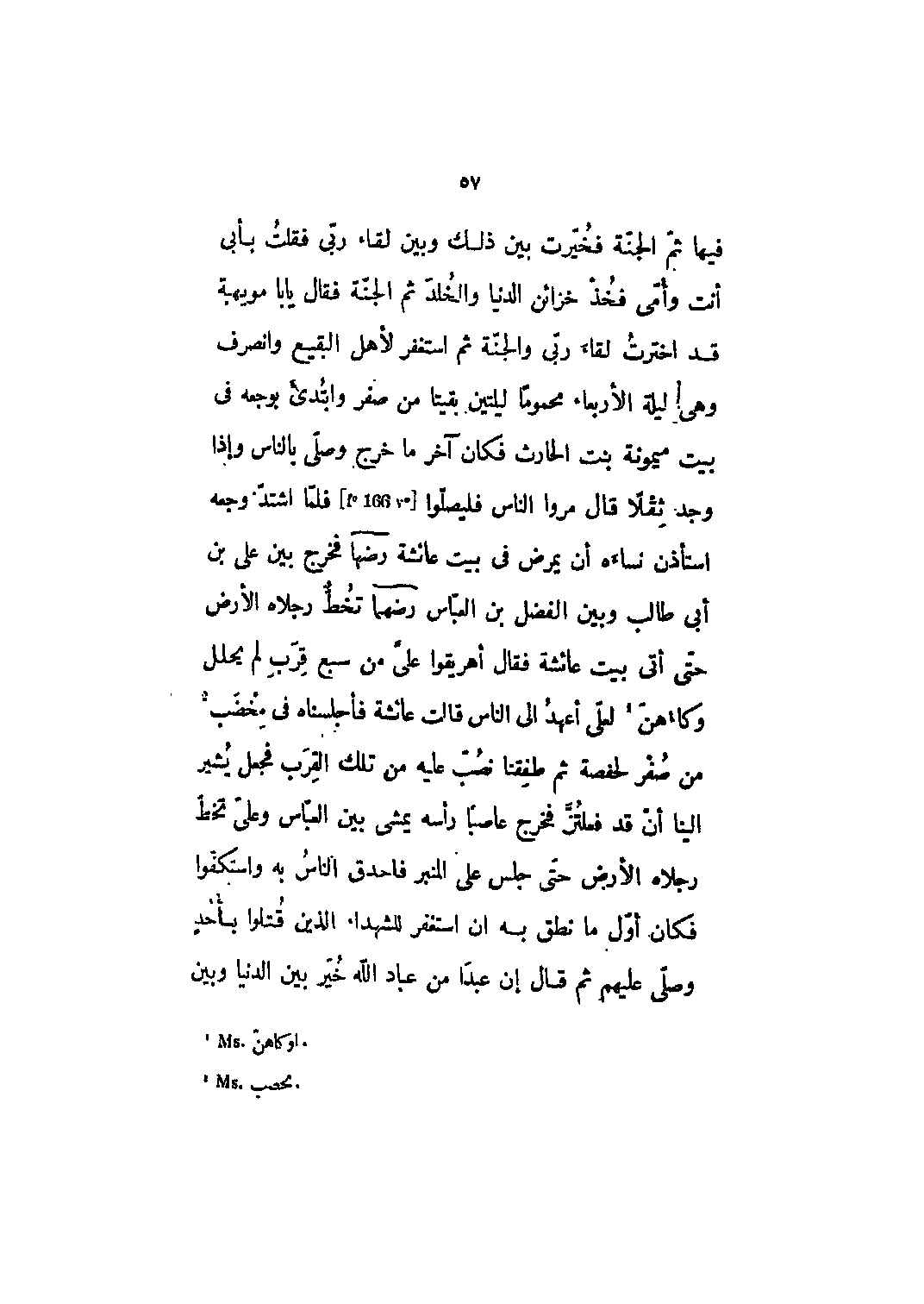 فيها ثم الجنة فخيرت بين ذلك وبين لقاء ربي فقلت بأبي أنت وأمي فخذ خزائن الدنيا والخلد ثم الجنة فقال يا با مويهبة قد اخترت لقاء ربي والجنة ثم استغفر لأهل البقيع وانصرف وهي ليلة الأربعاء محموماً ليلتين بقيتا من صفر وابتدئ بوجعه في بيت ميمونة بنت الحارث فكان آخر ما خرج وصلى بالناس وإذا وجد ثقلاً قال مروا الناس فليصلوا [F؟ 166 v؟] فلما اشتد وجعه استأذن نساءه أن يمرض في بيت عائشة رضي الله عنها فخرج بين علي بن أبي طالب وبين الفضل بن العباس رضي الله عنهما تخط رجلاه الأرض حتى أتى بيت عائشة فقال أهريقوا علي من سبع قرب لم يحلل وكاهن [1] لعلي أعهد إلى الناس قالت عائشة فأجلسناه في مخضب [2] من صفر لحفصة ثم طفقنا نصب عليه من تلك القرب فجعل يشير إلينا أن قد فعلتن فخرج عاصباً رأسه يمشي بين العباس وعلي تخط رجلاه الأرض حتى جلس على المنبر فأحدق الناس به واستكفوا فكان أول ما نطق به أن استغفر للشهداء الذين قتلوا بأحدٍ وصلى عليهم ثم قال إن عبداً من عباد الله خير بين الدنيا وبين