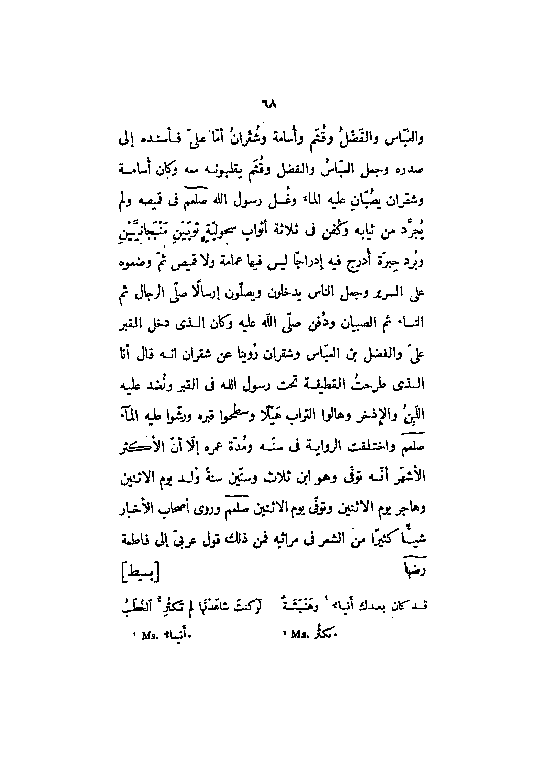 والعباس والفضل وقثم وأسامة وشقران أما علي فأسنده إلى صدره وجعل العباس والفضل وقثم يقلبونه معه وكان أسامة وشقران يصبان عليه الماء وغسل رسول الله صلى الله عليه وسلم في قميصه ولم يجرد من ثيابه وكفن في ثلاثة أثواب سحولية ثوبين منبجانيين وبرد حبرة أدرج فيه إدراجاً ليس فيها عمامة ولا قميص ثم وضعوه على السرير وجعل الناس يدخلون ويصلون إرسالاً صلى الرجال ثم النساء ثم الصبيان ودفن صلى الله عليه وكان الذي دخل القبر علي والفضل بن العباس وشقران روينا عن شقران أنه قال أنا الّذي طرحت القطيفة تحت رسول الله في القبر ونضد عليه اللبن والإذخر وهالوا التراب هيلاً وسطحوا قبره ورشوا عليه الماء صلى الله عليه وسلم واختلفت الرواية في سنه ومدة عمره إلا أن الأكثر الأشهر أنه توفي وهو ابن ثلاث وستين سنة ولد يوم الاثنين وهاجر يوم الاثنين وتوفي يوم الاثنين صلى الله عليه وسلم وروى أصحاب الأخبار شيئاً كثيراً من الشعر في مراثيه فمن ذلك قول عربىّ إلى فاطمة رضي الله عنها [بسيط]