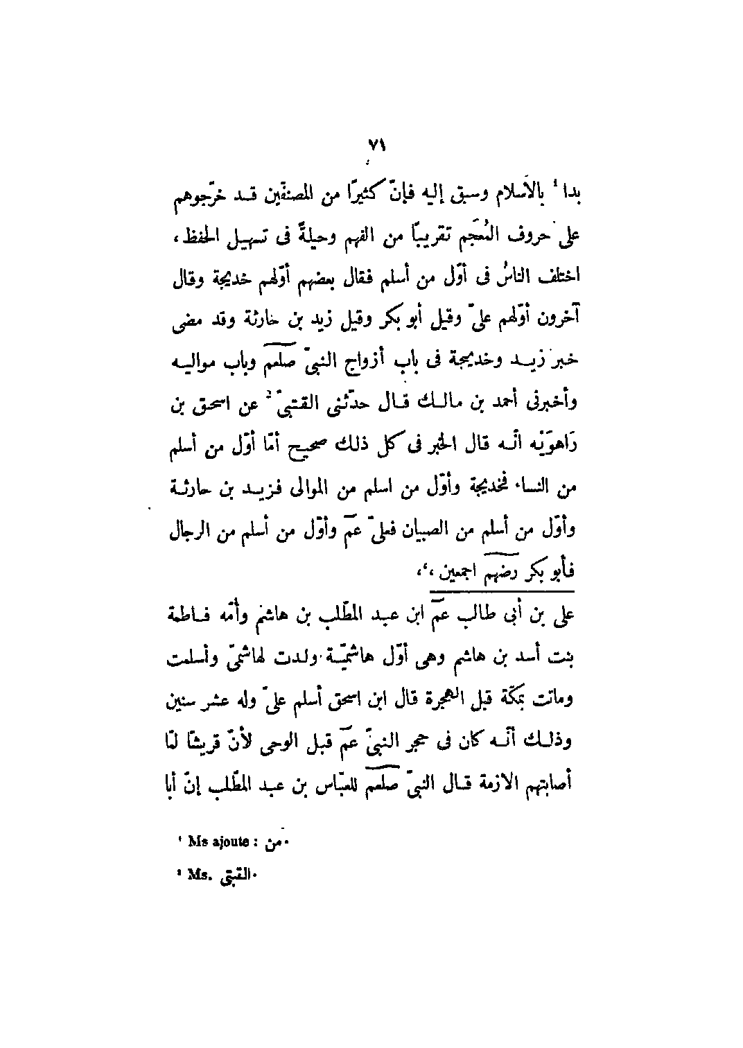 بدأ [1] بالإسلام وسبق إليه فإن كثيراً من المصنفين قد خرجوهم على حروف المعجم تقريباً من الفهم وحيلة في تسهيل الحفظ، اختلف الناس في أول من أسلم فقال بعضهم أولهم خديجة وقال آخرون أولهم علي وقيل أبو بكر وقيل زيد بن حارثة وقد مضى خبر زيد وخديجة في باب أزواج النبي صلى الله عليه وسلم وباب مواليه وأخبرني أحمد بن مالك قال حدثني القتبي [2] عن إسحاق بن راهويه أنه قال الخبر في كل ذلك صحيح أما أول من أسلم من النساء فخديجة وأول من أسلم من الموالي فزيد بن حارثة وأول من أسلم من الصبيان فعليّ عم وأول من أسلم من الرجال فأبو بكر رضي الله عنهم أجمعين،،،