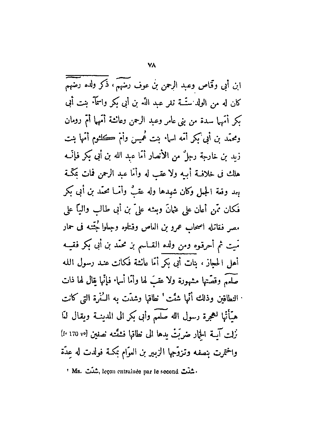 أما عائشة فكانت عند رسول الله صلى الله عليه وسلم وقصتها مشهورة ولا عقب لها وأما أسماء فإنها يقال لها ذات النطاقين وذلك أنها شقت [1] نطاقها وشدت به السفرة التي كانت هيأتها لهجرة رسول الله صلى الله عليه وسلم وأبي بكر إلى المدينة ويقال لما نزلت آية الخمار ضربت يدها إلى نطاقها فشقته نصفين [F؟ 170 v؟] واختمرت بنصفه وتزوجها الزبير بن العوّام بمكة فولدت له عدّة