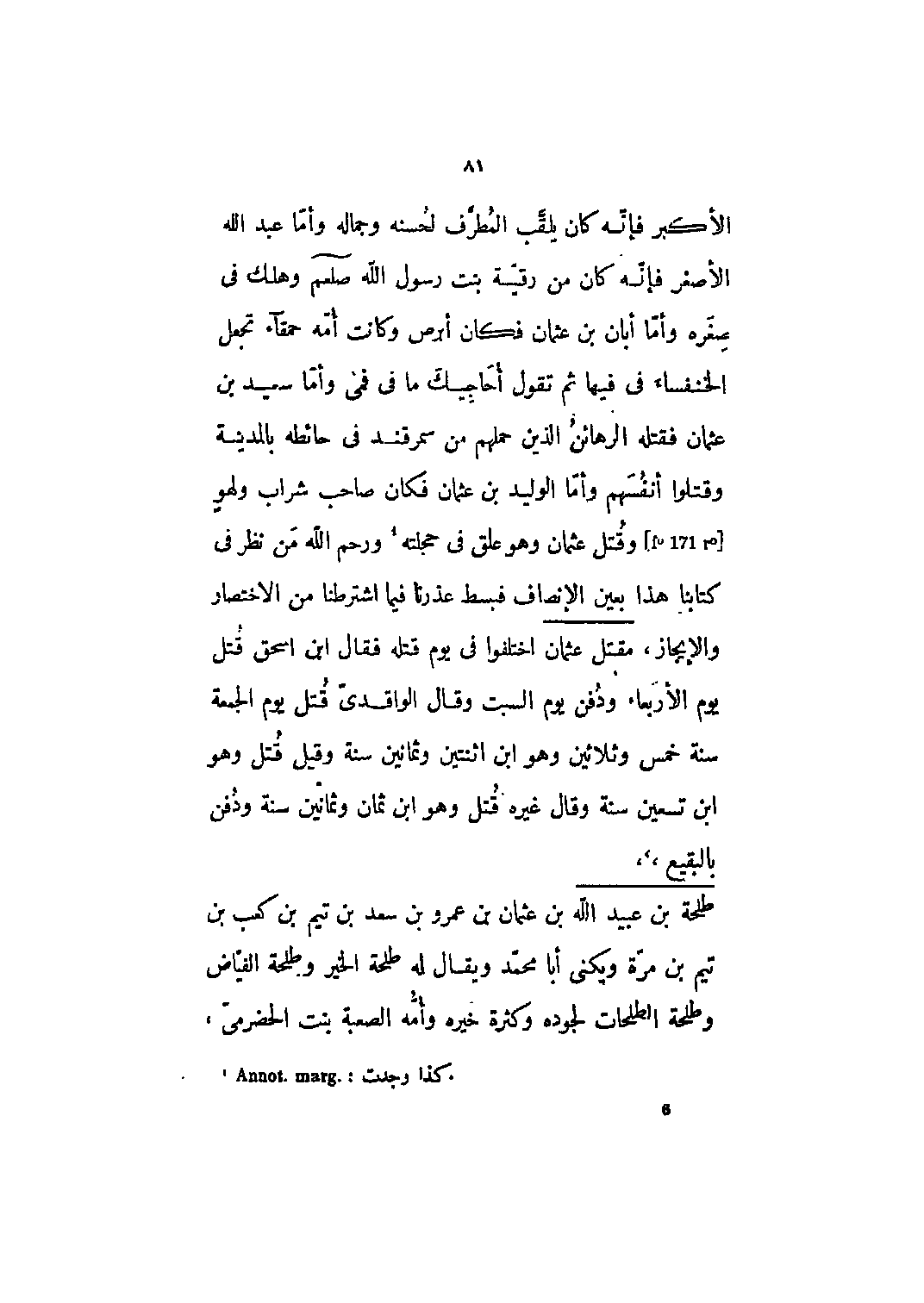 الأكبر فإنه كان يلقب المطرف لحسنه وجماله وأما عبد الله الأصغر فإنه كان من رقية بنت رسول الله صلى الله عليه وسلم وهلك في صغره وأما أبان بن عثمان فكان أبرص وكانت أمه حمقاء تجعل الخنفساء في فيها ثم تقول أحاجيك ما في فمي وأما سعيد بن عثمان فقتله الرهائن الذين حملهم من سمرقند في حائطه بالمدينة وقتلوا أنفسهم وأمّا الوليد بن عثمان فكان صاحب شرابٍ ولهوٍ [F؟ 171 r؟] وقتل عثمان وهو علق في حجلته [1] ورحم الله من نظر في كتابنا هذا بعين الإنصاف فبسط عذرنا فيما اشترطنا من الاختصار والإيجاز،