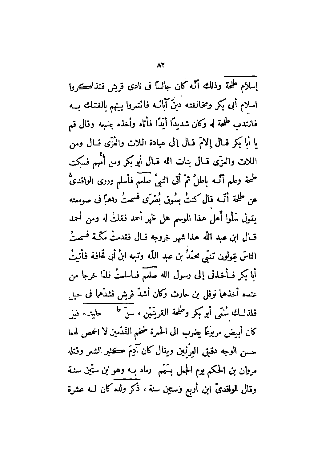 قيل كان أبيض مربوعاً يضرب إلى الحمرة ضخم القدمين لا أخمص لهما حسن الوجه دقيق العرنين ويقال كان آدم كثير الشعر وقتله مروان بن الحكم يوم الجمل بسهمٍ رماه به وهو ابن ستين سنة وقال الواقدي ابن أربعٍ وستين سنة،