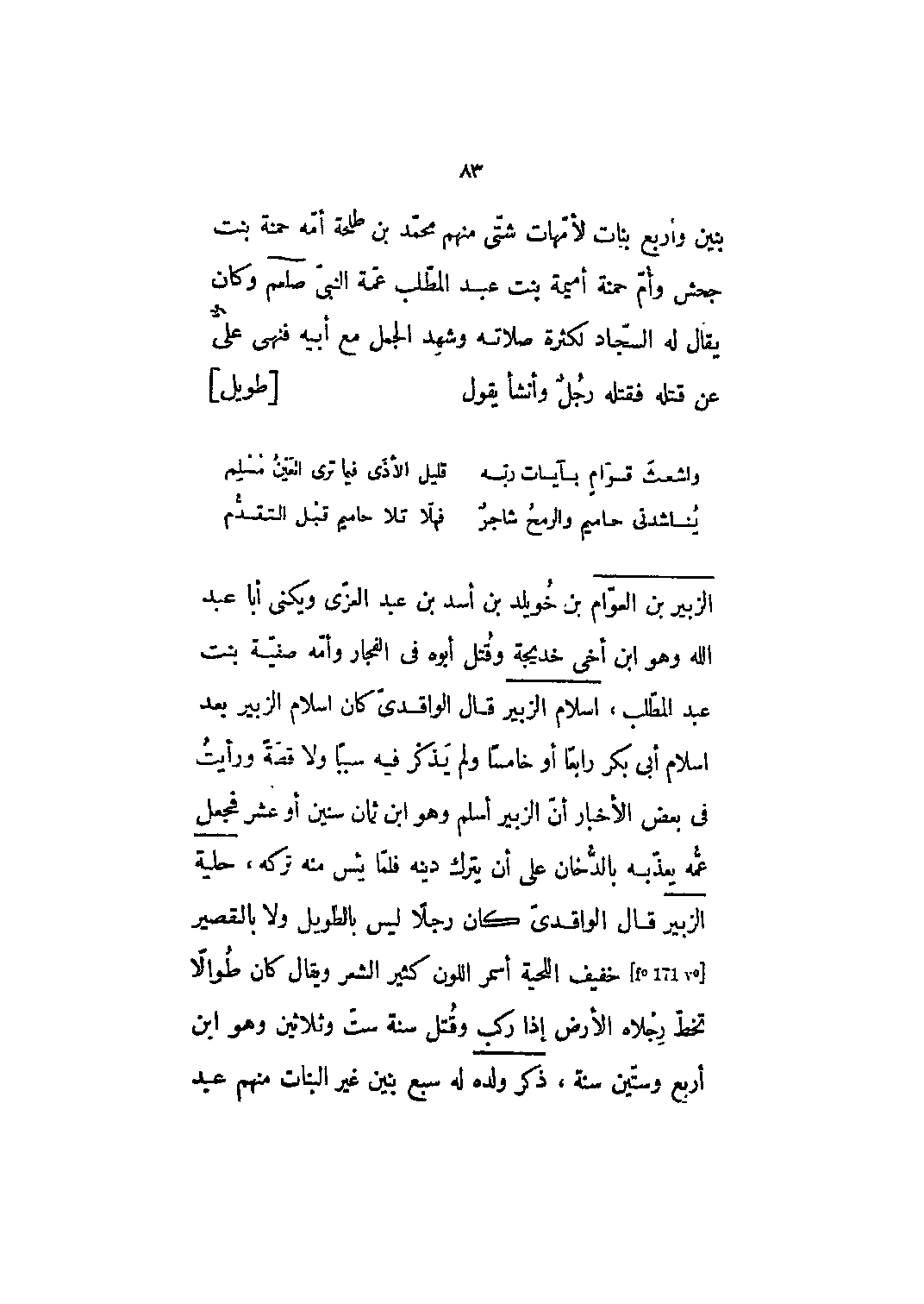 قال الواقدي كان رجلاً ليس بالطويل ولا بالقصير [F؟ 171 v؟] خفيف اللحية أسمر اللون كثير الشعر ويقال كان طوالاً تخط رجلاه الأرض إذا ركب وقتل سنة ست وثلاثين وهو ابن أربع وستين سنة،