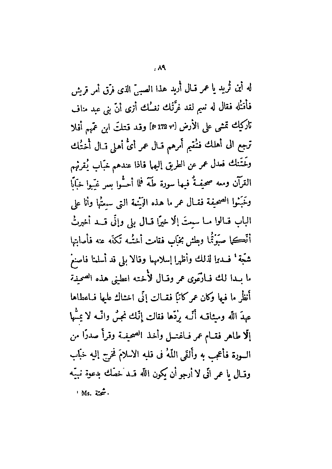 له أين تريد يا عمر قال أريد هذا الصبي الذي فرق أمر قريشٍ فأقتله فقال له نعيم لقد غرتك نفسك أترى أن بني عبد مناف تاركيك تمشي على الأرض [F؟ 172 v؟] وقد قتلت ابن عمهم أفلا ترجع إلى أهلك فتقيم أمرهم قال عمر أي أهلي قال أختك وختنك فعدل عمر عن الطريق إليهما فإذا عندهم خباب يقرئهم القرآن ومعه صحيفة فيها سورة طه فلما أحسوا بعمر غيبوا خباباً وخبئوا الصحيفة فقال عمر ما هذه الهينمة التي سمعتها وأنا على الباب قالوا ما سمعت إلا خيراً قال بلى وإني قد أخبرت أنكما صبوتما وبطش بخباب فقامت أخته تكفه عنه فأصابتها شجةً [1] فدبرا لذلك وأظهرا إسلامهما وقالا بلى قد أسلمنا فاصنع ما بدا لك فارعوى عمر وقال لأخته أعطيني هذه الصحيفة أنظر ما فيها وكان عمر كاتباً فقالت إني أخشاك عليها فأعطاها عهد الله وميثاقه أنه يردها فقالت إنك نجس وإنه لا يمسها إلا طاهر فقام عمر فاغتسل وأخذ الصحيفة وقرأ صدراً من السورة فأعجب به وألقى الله في قلبه الإسلام فخرج إليه خباب وقال يا عمر إني لا أرجو أن يكون الله قد خصك بدعوة نبيّه