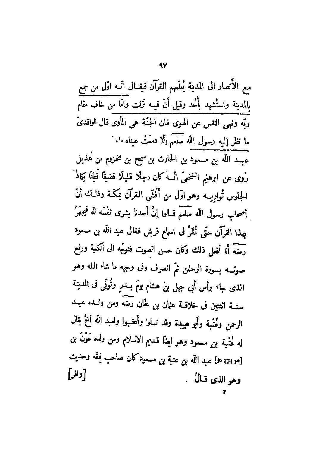 بن الحارث بن سمح بن مخزوم من هذيل روي عن ابراهيم النخعي أنه كان رجلا قليلاً قضيفاً فطناً يكاد الجلوس تواريه وهو أول من أفشى القرآن بمكة وذلك أن أصحاب رسول الله صلى الله عليه وسلم قالوا إن أحدنا يشري نفسه للَّه فيجهر بهذا القرآن حتى تقر في أسماع قريش فقال عبد الله بن مسعود رضي الله عنه أنا أفعل ذلك وكان حسن الصوت فتوجه إلى الكعبة ورفع صوته بسورة الرحمن ثم انصرف وفي وجهه ما شاء الله وهو الذي جاء برأس أبي جهل بن هشام يوم بدرٍ وتوفي في المدينة سنة اثنتين في خلافة عثمان بن عفان رضي الله عنه ومن ولده عبد الرحمن وعتبة وأبو عبيدة وقد نسلوا وأعقبوا ولعبد الله أخ يقال له عتبة بن مسعود وهو أيضاً قديم الإسلام ومن ولده عون بن [F؟ 174 r؟] عبد الله بن عتبة بن مسعود كان صاحب فقه وحديث وهو الّذي قال [وافر]