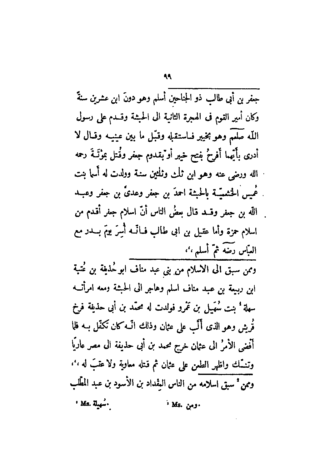 أسلم وهو دون ابن عشرين سنة وكان أمير القوم في الهجرة الثانية إلى الحبشة وقدم على رسول الله صلى الله عليه وسلم وهو بخيبر فاستقبله وقبل ما بين عينيه وقال لا أدري بأيهما أفرح بفتح خيبر أو بقدوم جعفر وقتل بمؤتة رحمه الله ورضى عنه وهو ابن ثلث وثلاثين سنة وولدت له أسماء بنت عميس الخثعمية بالحبشة أحمد بن جعفر وعدي بن جعفر وعبد الله بن جعفر وقد قال بعض الناس أن إسلام جعفر أقدم من إسلام حمزة وأما عقيل بن أبي طالب فإنه أسر يوم بدر مع العباس رضي الله عنه ثم أسلم،،،