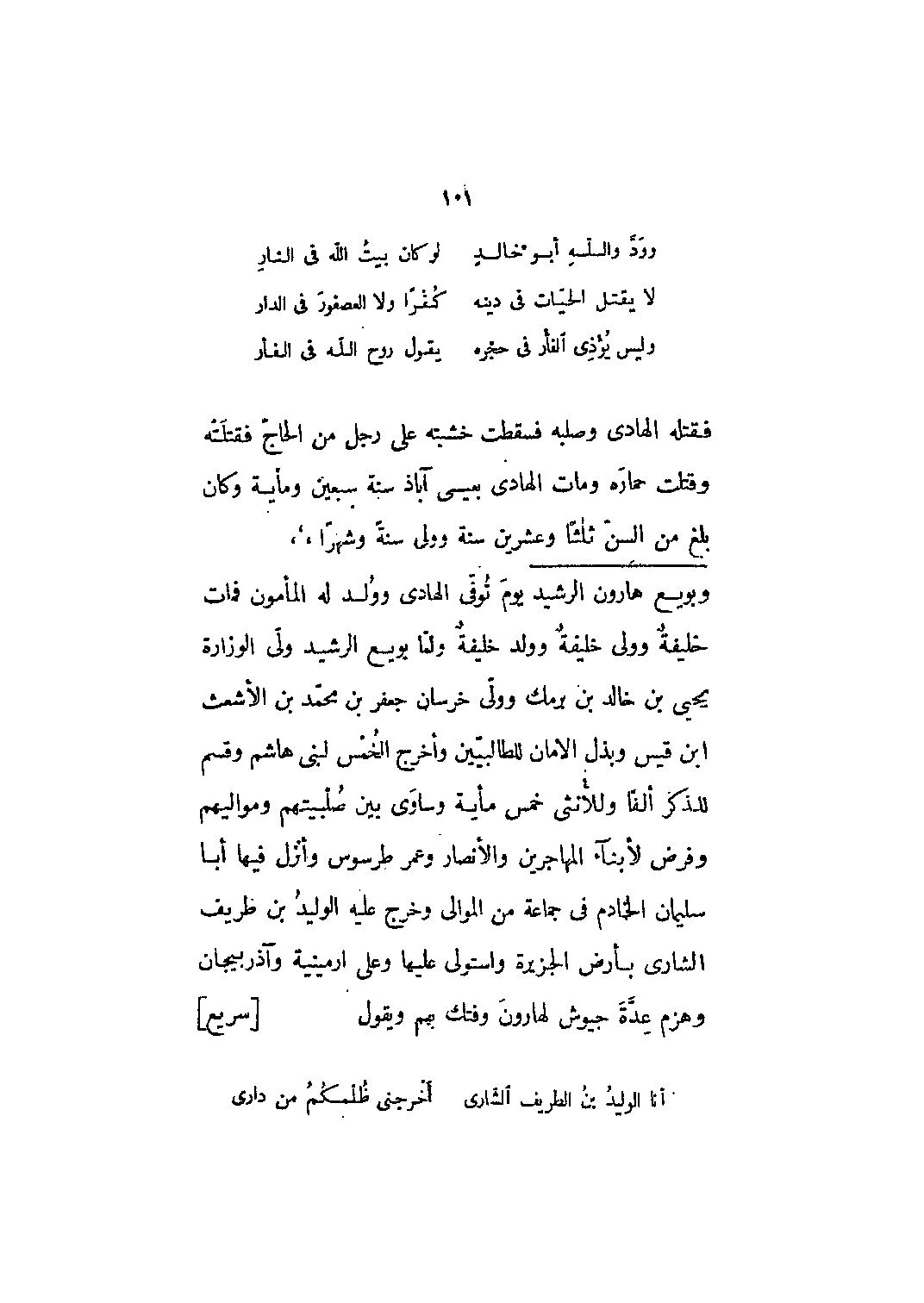 يوم توفي الهادي وولد له المأمون فمات خليفة وولى خليفة وولد خليفة ولما بويع الرشيد ولي الوزارة يحيى بن خالد بن برمك وولى خرسان جعفر بن محمّد بن الأشعث ابن قيس وبذل الأمان للطالبيين وأخرج الخمس لبني هاشم وقسم للذكر ألفا وللأنثى خمسمائة وساوى بين صلبتيهم ومواليهم وفرض لأبناء المهاجرين والأنصار وعمر طرسوس وأنزل فيها أبا سليمان الخادم في جماعة من الموالي وخرج عليه الوليد بن طريف الشاري بأرض الجزيرة واستولى عليها وعلى أرمينية وآذربيجان وهزم عدة جيوش لهارون وفتك بهم ويقول [سريع]